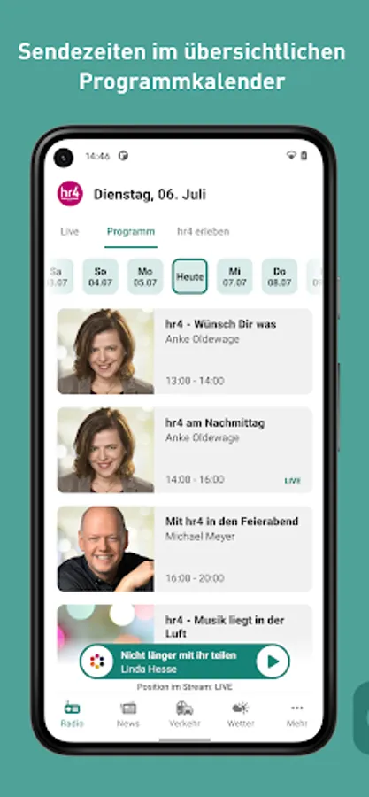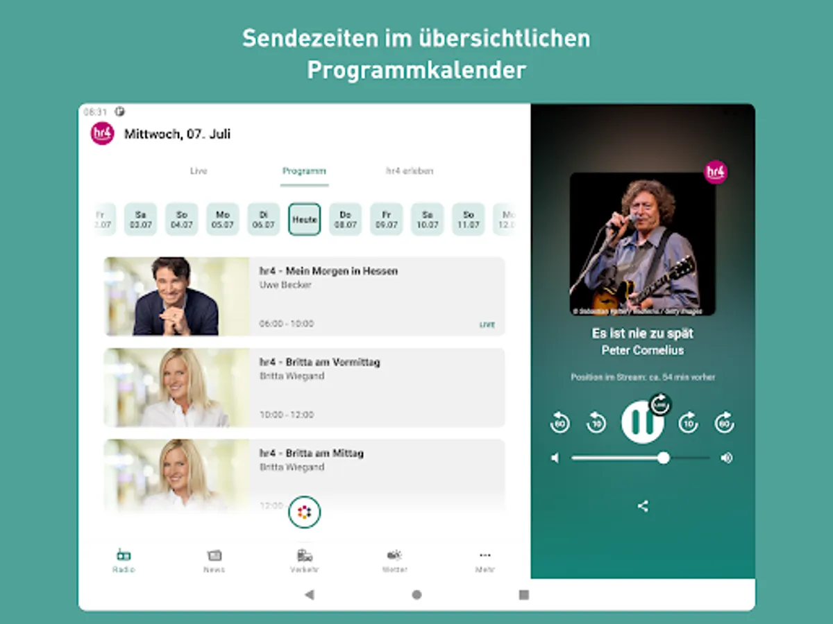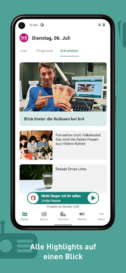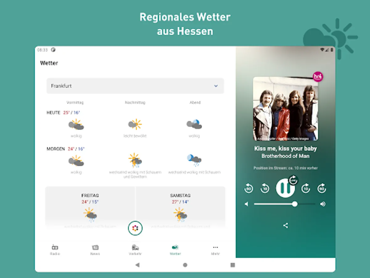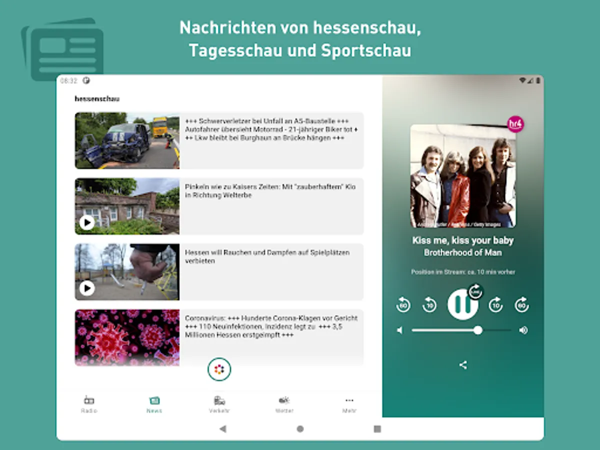 The new hr4 app is here! Listen to hr4 live, jump back in the program, current information, switch to all hr channels at any time, traffic and public transport reports as well as regional weather - all of this is available in the new app.