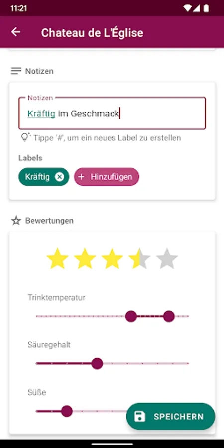 Of course you want to capture your taste and experience. In the intelligent note field you can write down everything that comes to mind about your wine. You can mark the main characteristics of your wine with labels you can create yourself. An automatic completion suggests labels that have already been used.