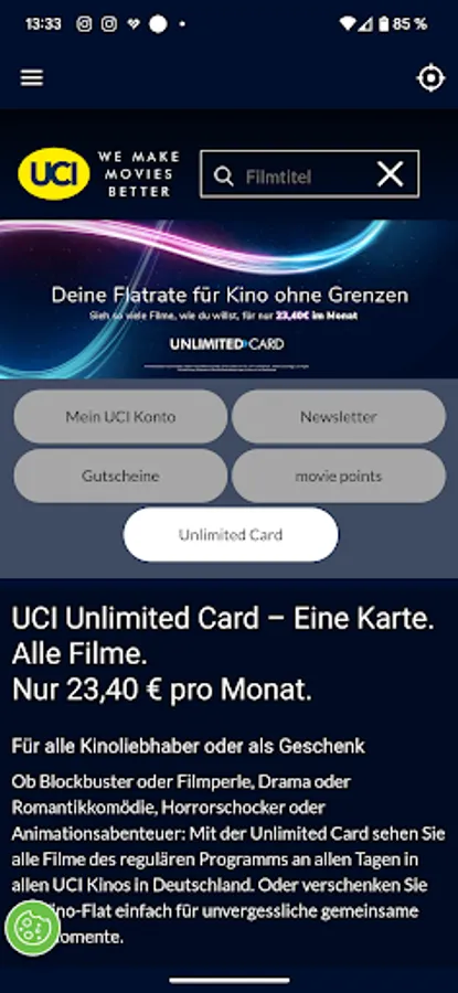 Book your favorite seats online: Conveniently select seats and book cinema tickets for all UCI cinemas directly. All current film trailers, film content, schedules, news and events. Manage my UCI account, unlimited card, movie points and much more. Simply cancel your tickets if you don't go to the cinema.