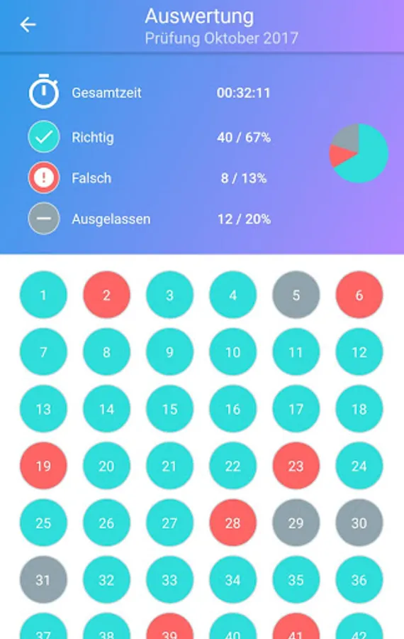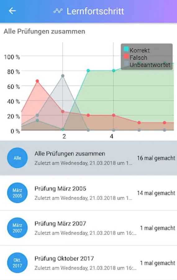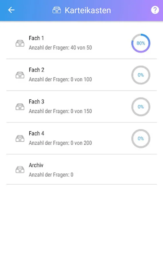All your wrong questions are automatically collected for you in our digital card system. You will be asked to repeat the individual subjects at regular intervals. Difficult questions and different topics are repeated regularly and ensure effective learning success!