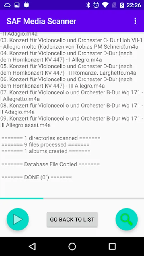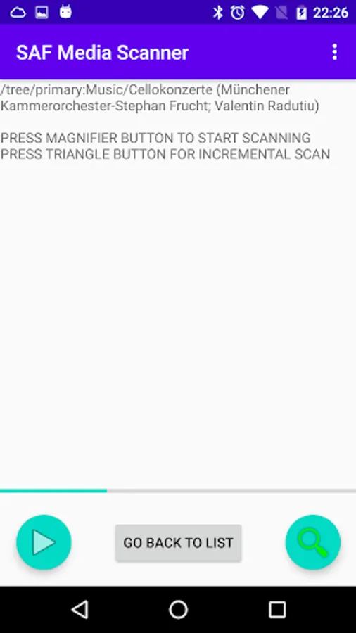 Contrary to the Classical Music Scanner, the SAF Media Scanner exclusively uses Google's Storage Access Framework (SAF), thus allowing access to media not available via the standard methods (like USB storage with older Android versions or generally network shares).