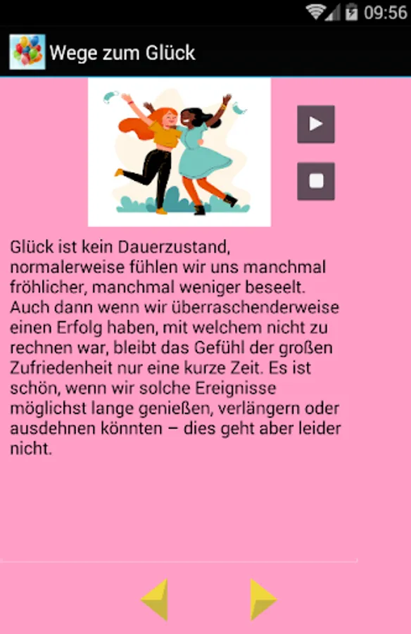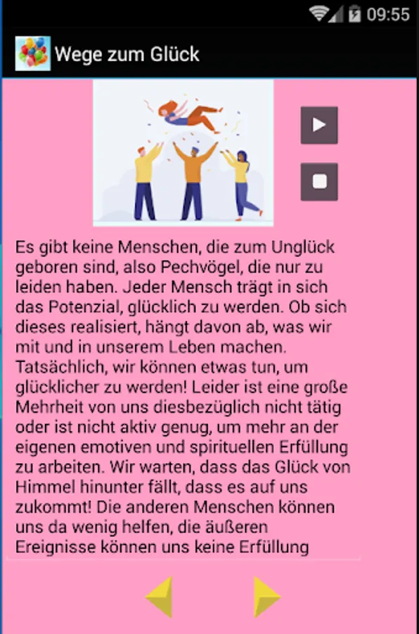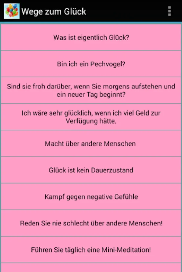 There are no people born to misfortune, unlucky people who only have to suffer. Everyone has the potential to be happy. Whether this is realized depends on what we do with and in our life. Indeed, there is something we can do to be happier! Unfortunately, a large majority of us are not active in this regard or are not active enough to work more on our own emotional and spiritual fulfillment. We are waiting for happiness to fall from heaven, for us to come! The other people can do little to help us there, the external events cannot give us fulfillment, only we can make a difference in our own lives and expand a bit of bliss! To do that, you have to internalize some principles and try to follow them every day! This application helps you with that.