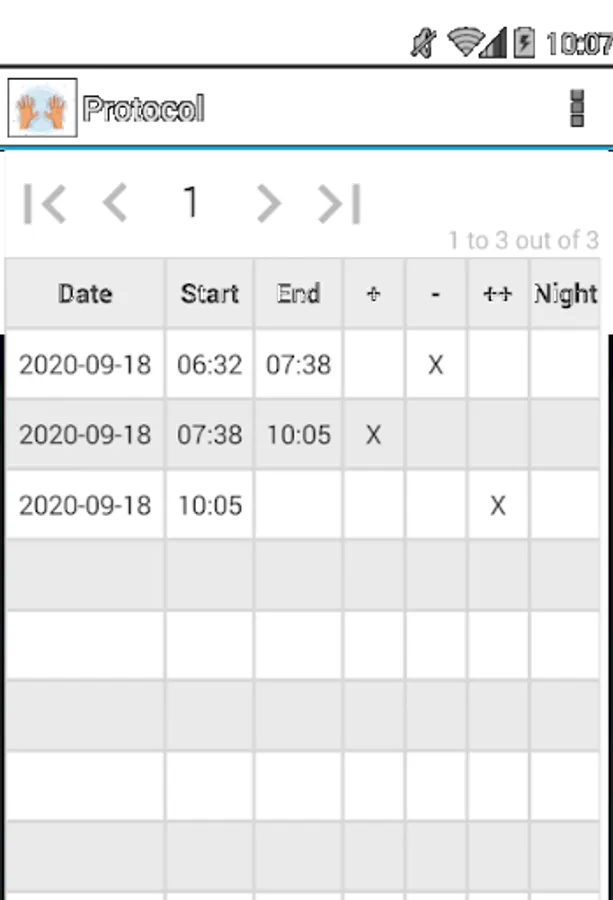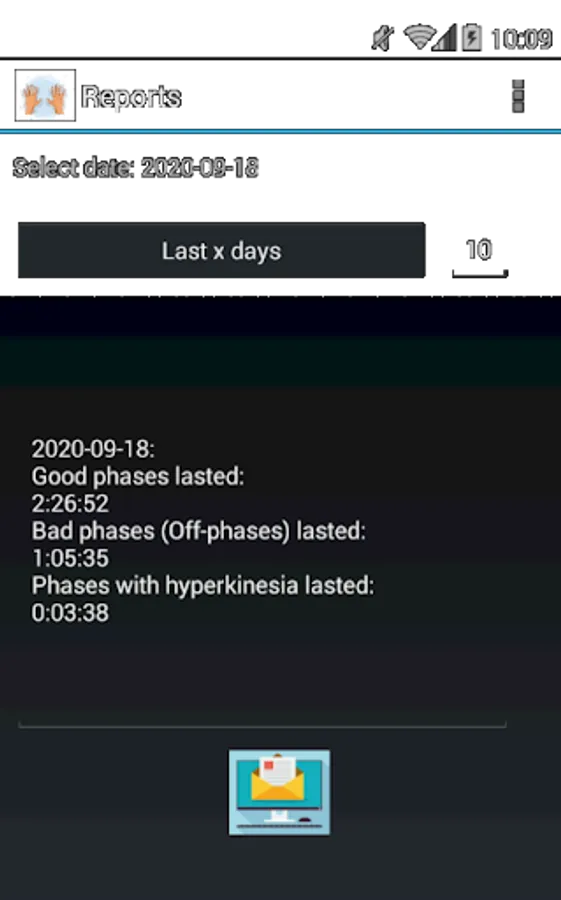 The user can see all saved values and create a report with the summary (duration of all phases) for the selected day (or the last 10, 20 or more days). The report can then be sent to an email address (for example) to the doctor.