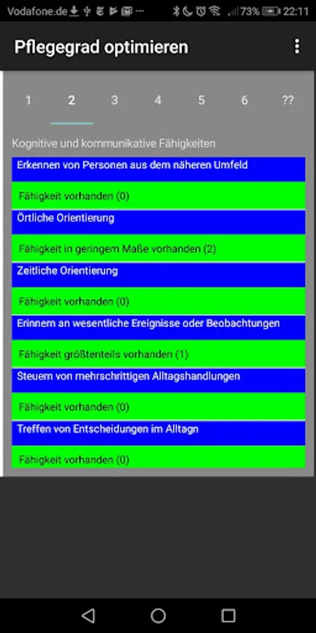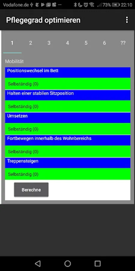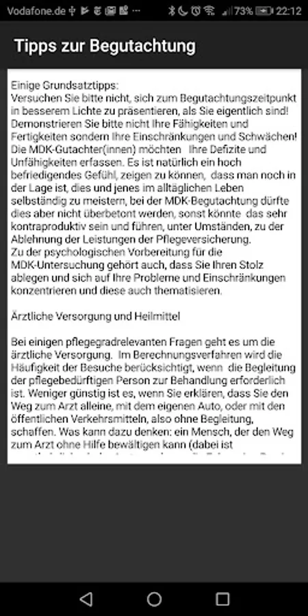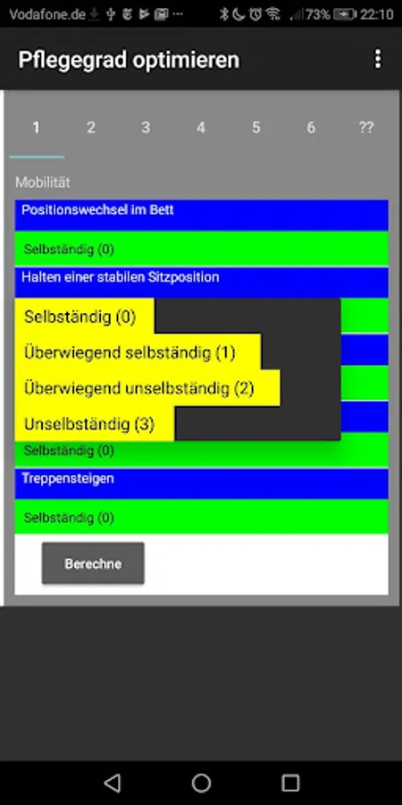 Application for calculating the degree of care with many useful tips to achieve the optimum result. The determination of the degree of care is carried out in 5 steps or modules. In each area, you will receive concrete advice on how to realistically represent your nursing-relevant independence and how to avoid frequent mistakes in the presentation. Particular attention is drawn to frequent errors of reasoning which can have a negative effect on the final result.
