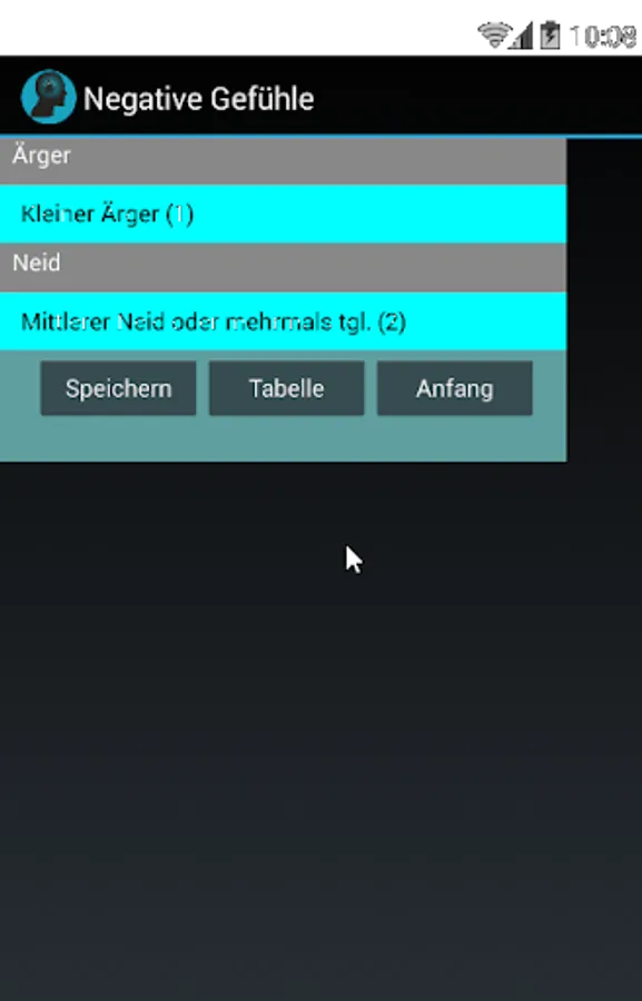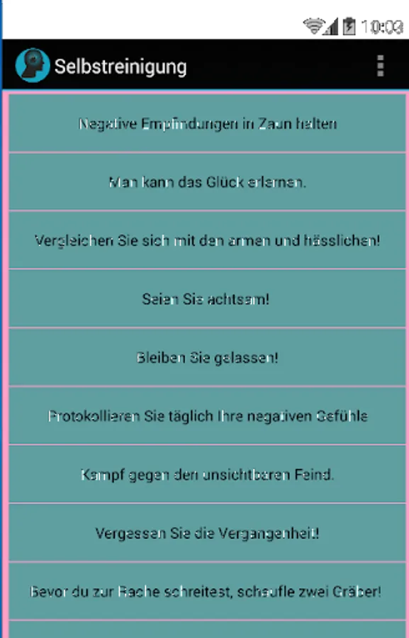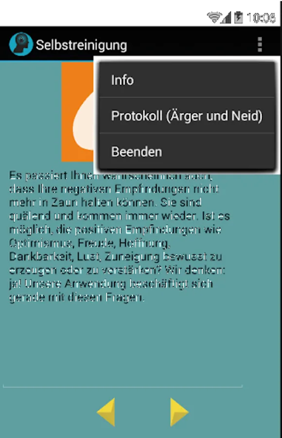 How do you work with this app? Just try to implement the advice from 1 to 10. Practice a relaxation method (points 11 and 12) because they are the best way to get rid of negative feelings. Also keep a record of the negative feelings, note your annoyance and envy every day (point 6, or menu item "Protocol"). This way you will gain an overview of your negative feelings in a period of time.