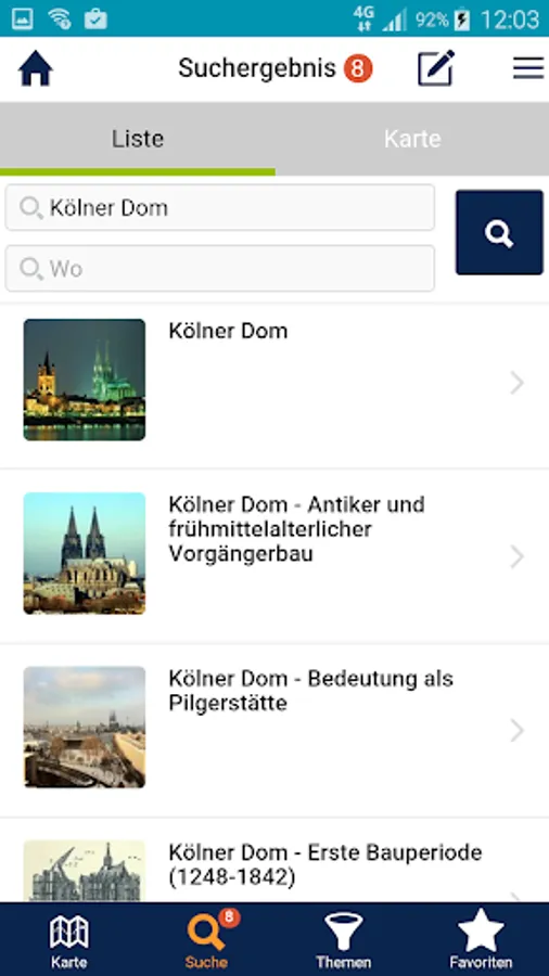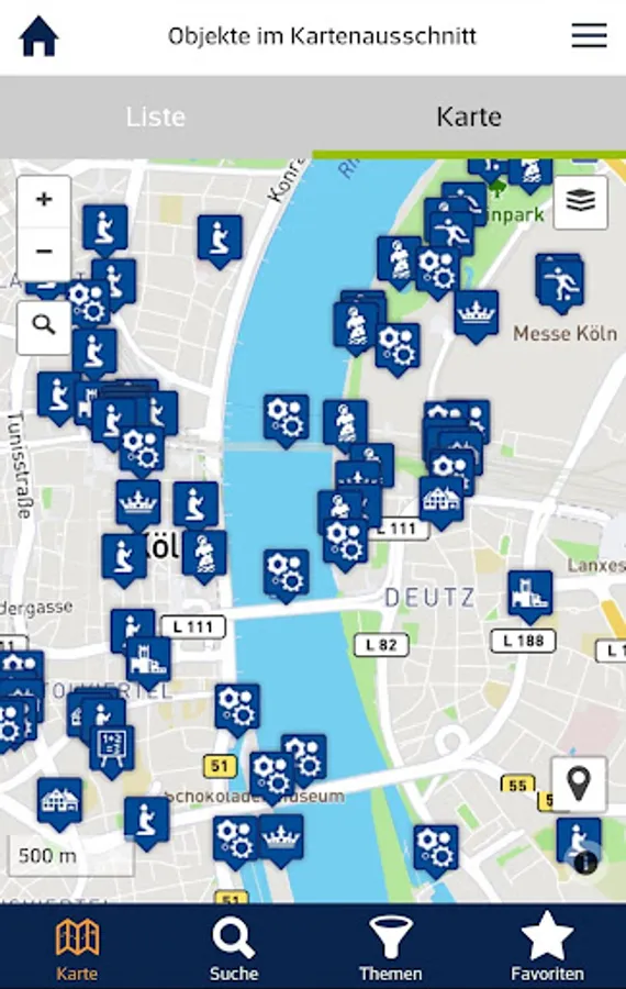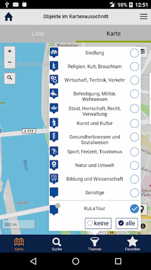 - Follow a story and take the KuLaTouren on a discovery tour: Interesting topics are now displayed directly as KuLaTouren bundled. They are suggestions for a topic-specific discovery of the environment. The order of the objects is indicated by a number symbol. When the route is selected, these numbers are displayed in red in the map view. Unselected KuLaTours are grayed out. The navigation is done externally by the coordinate transfer to any navigation system. KuLaTours are hidden in the theme view by default! For a search for tours the check mark must be set here.