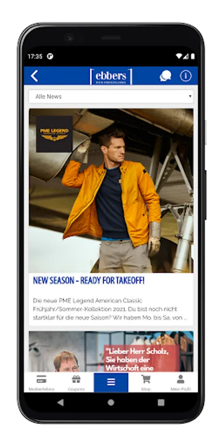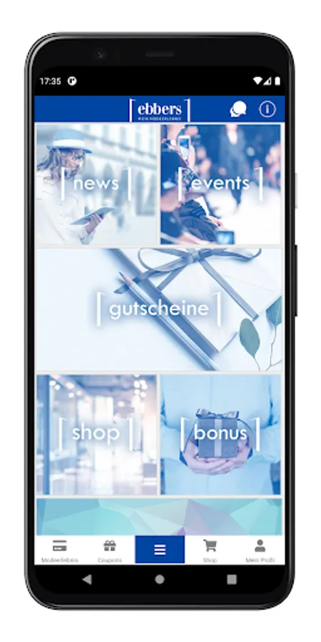 The app that combines all the advantages! Pure fashion experience. Enjoy exclusive advantages with the ebbers app and stay up-to-date with the latest fashion news from our fashion experience house. From now on you will always have your fashion experience card at hand in digital form. So shopping is twice as much fun: every purchase in our branches is credited to your customer account. You benefit from attractive and individual bonuses. With the ebbers app, you won't miss an invitation to our exclusive customer events. This is how shopping becomes an experience!