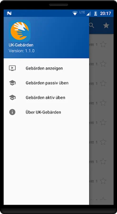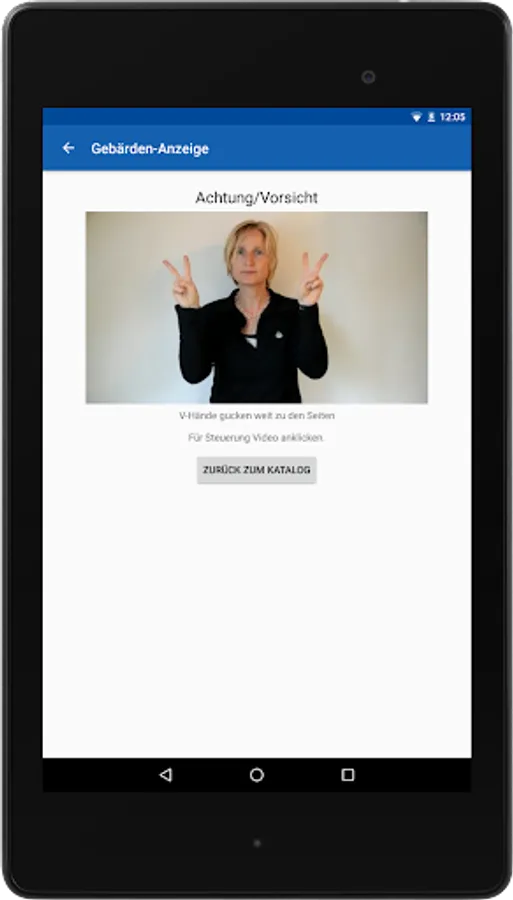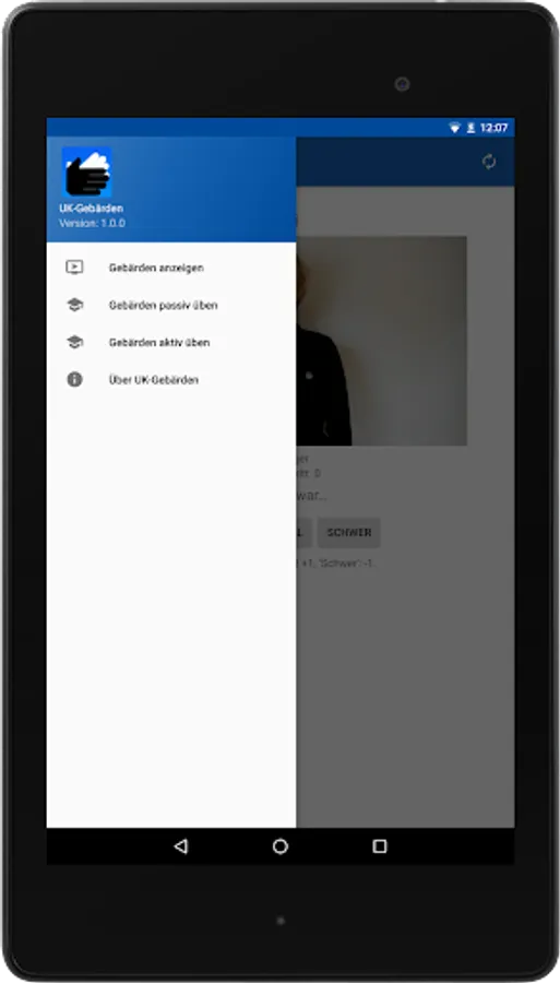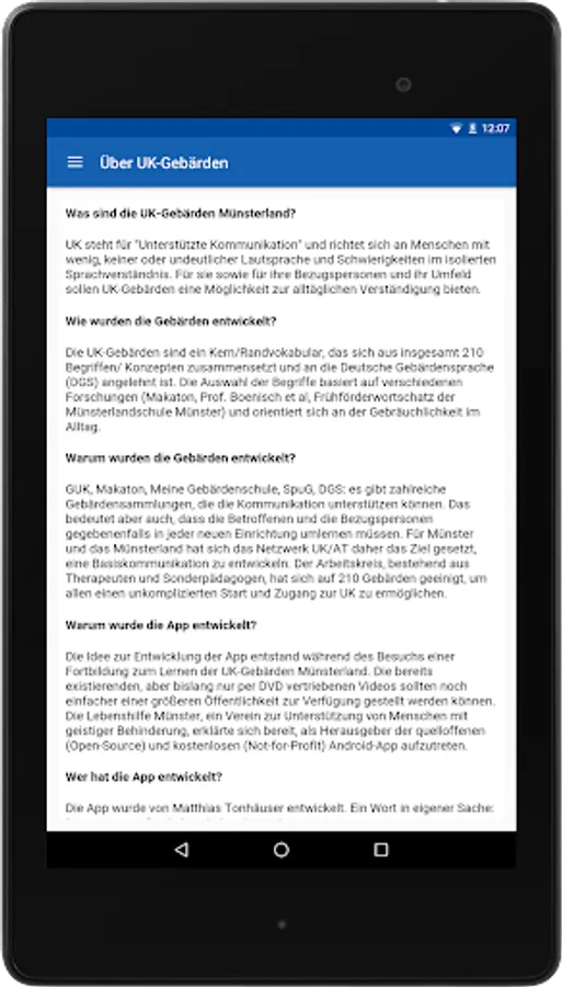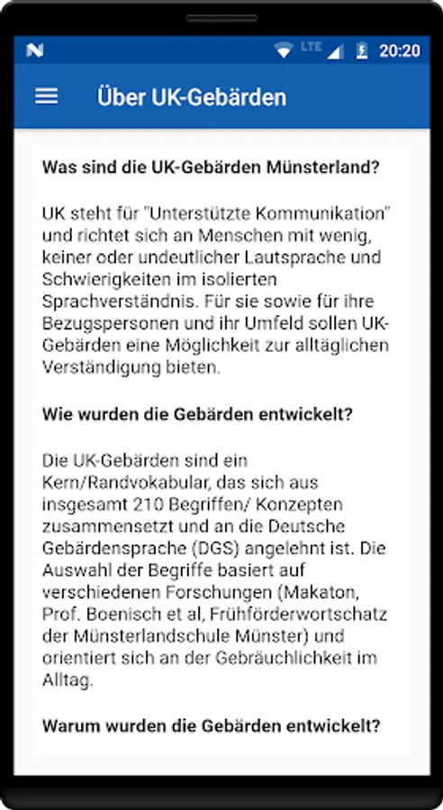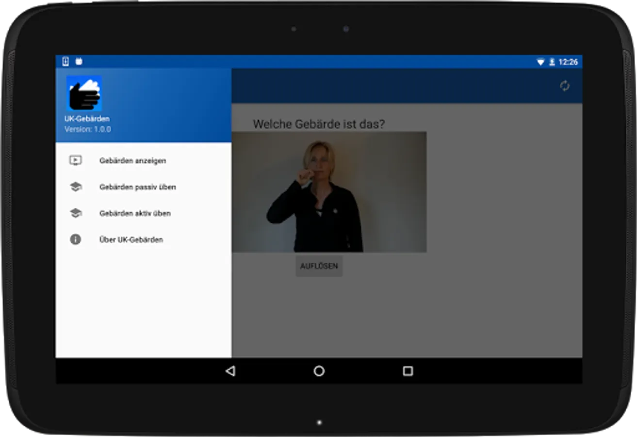 The purpose of this app is to look up and learn language-supporting signs from the "UK-Gebärden Münsterland" (UKGM) system. The system consists of 263 everyday signs and is intended to help people who have problems learning to speak to communicate with their relatives, friends and acquaintances. The app consists of three parts: