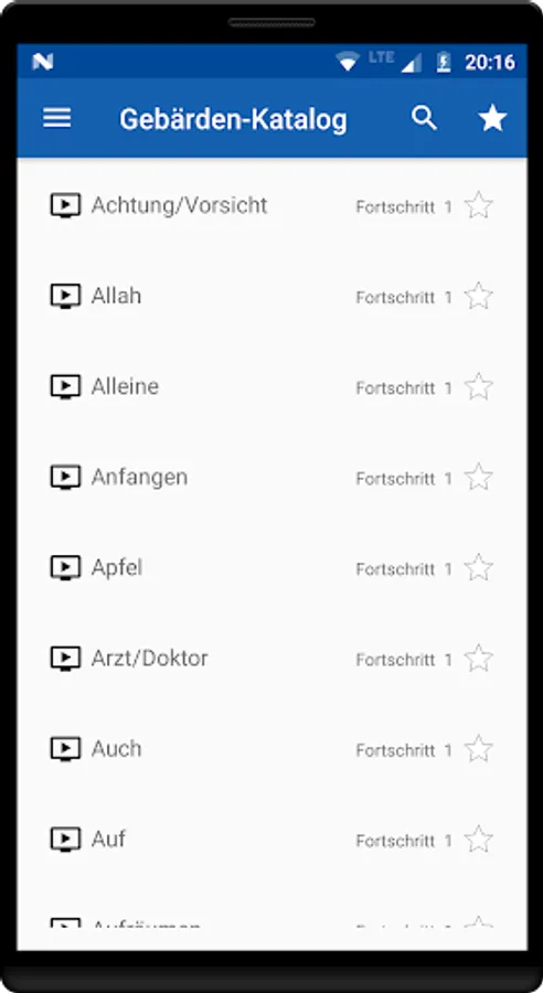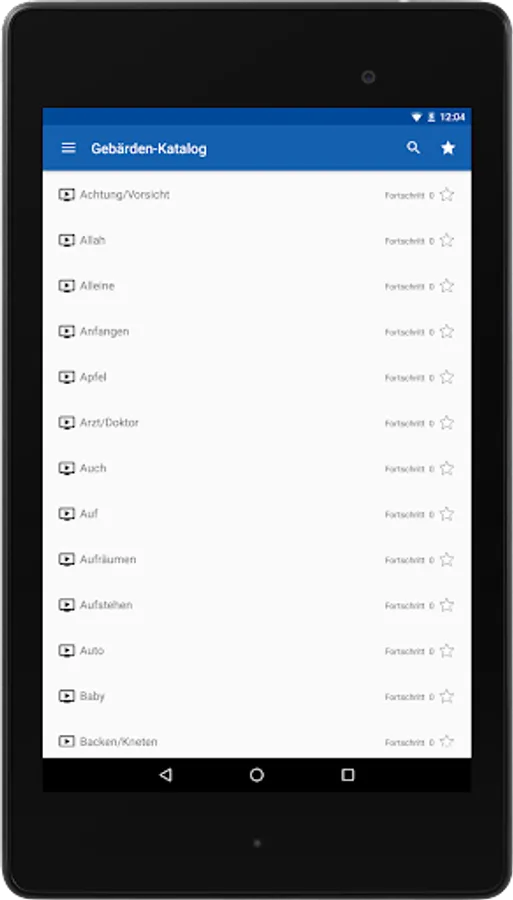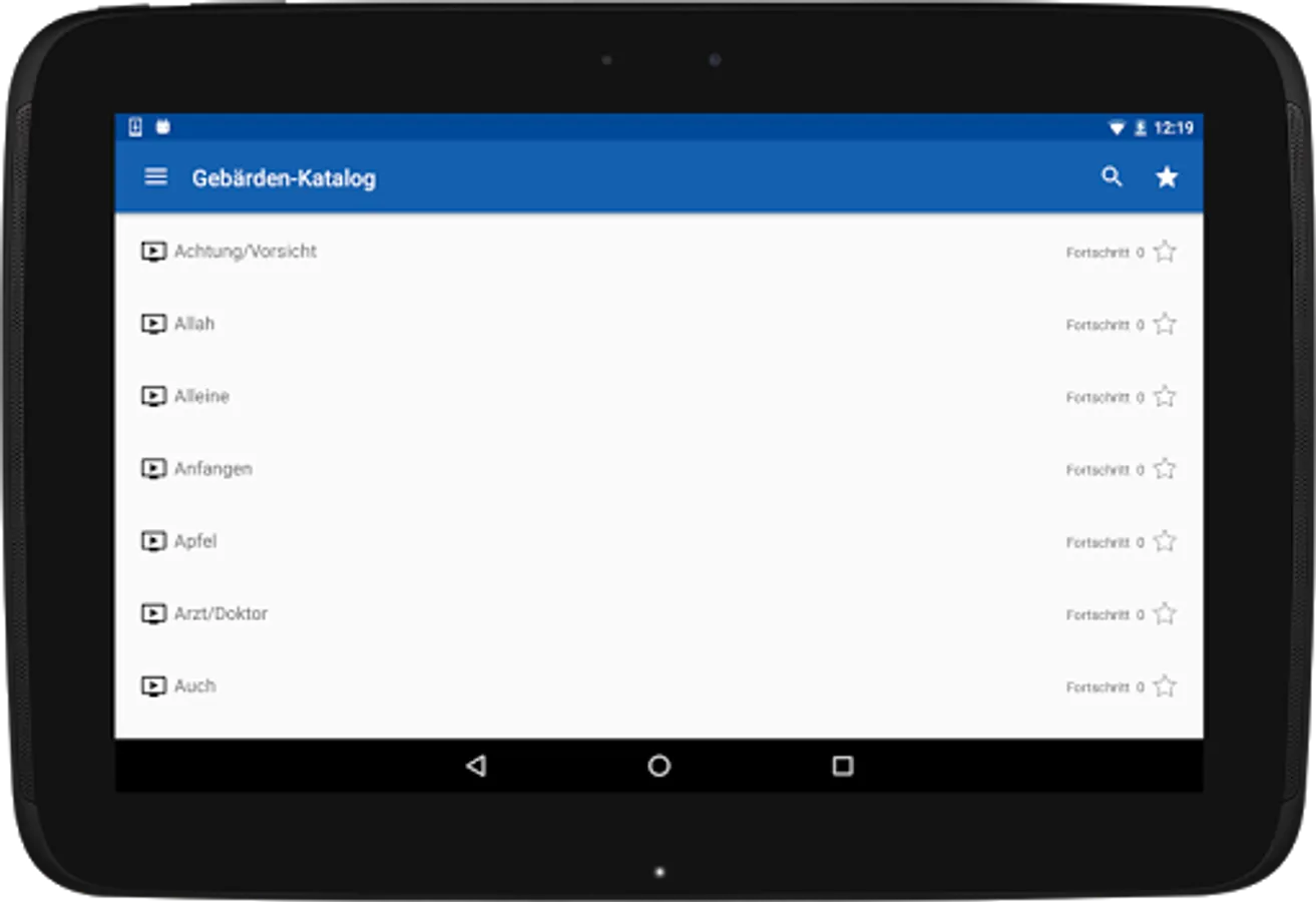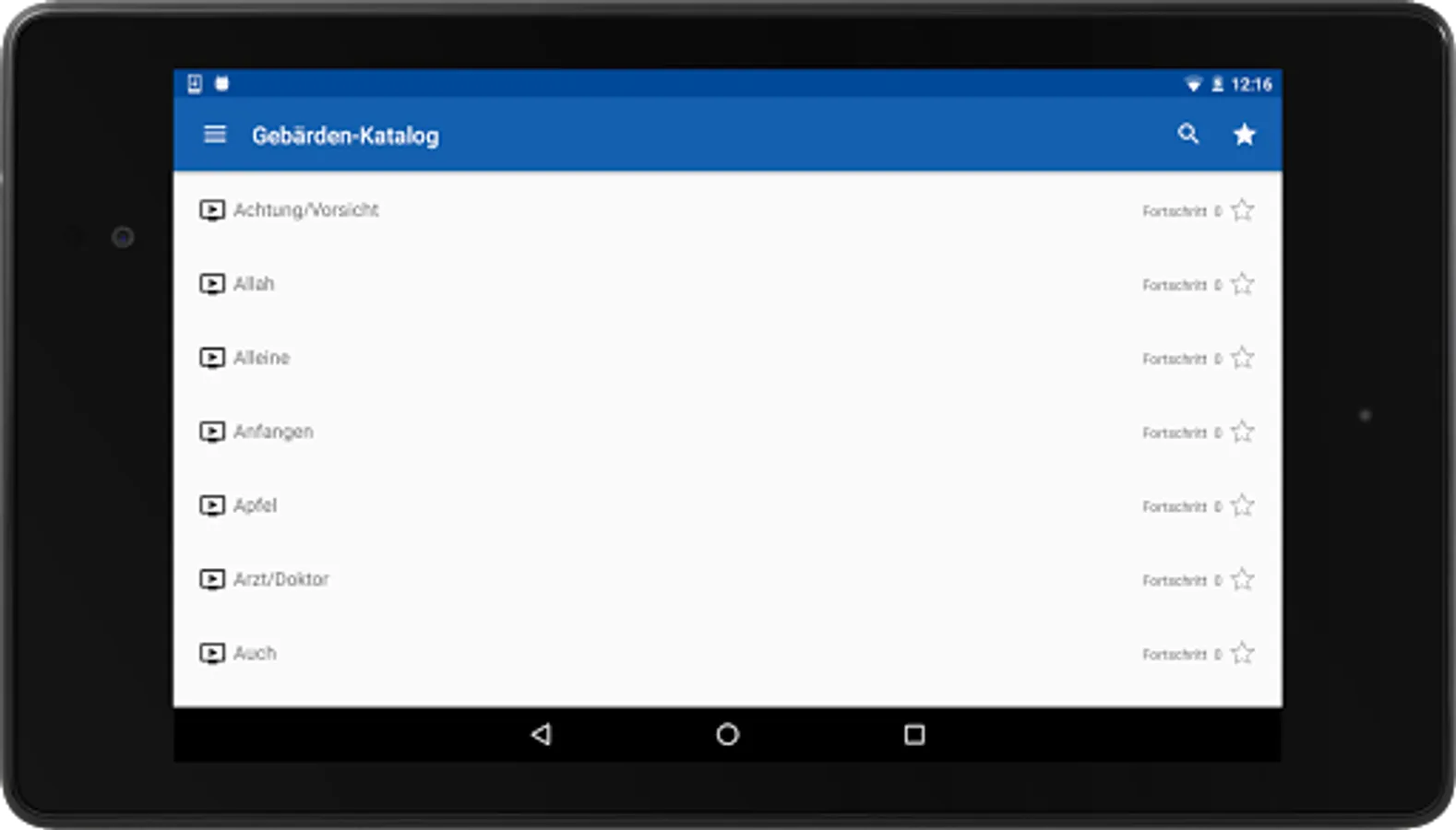 The purpose of this app is to look up and learn language-supporting signs from the "UK-Gebärden Münsterland" (UKGM) system. The system consists of 263 everyday signs and is intended to help people who have problems learning to speak to communicate with their relatives, friends and acquaintances. The app consists of three parts: