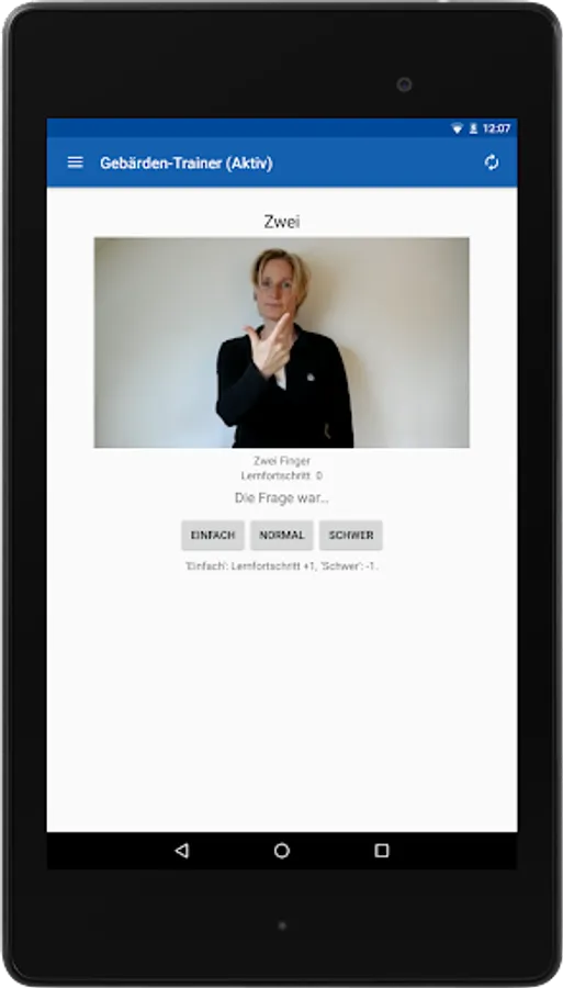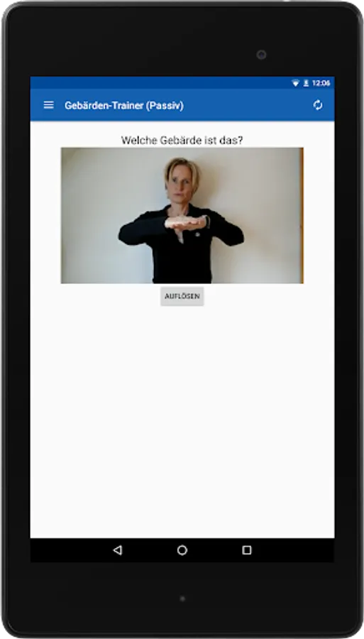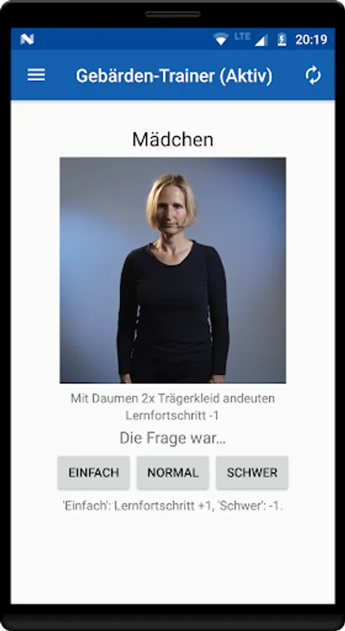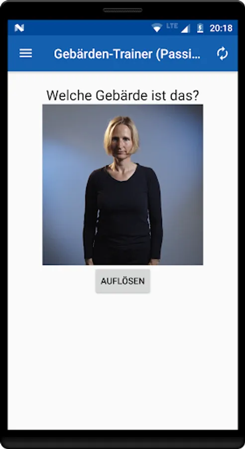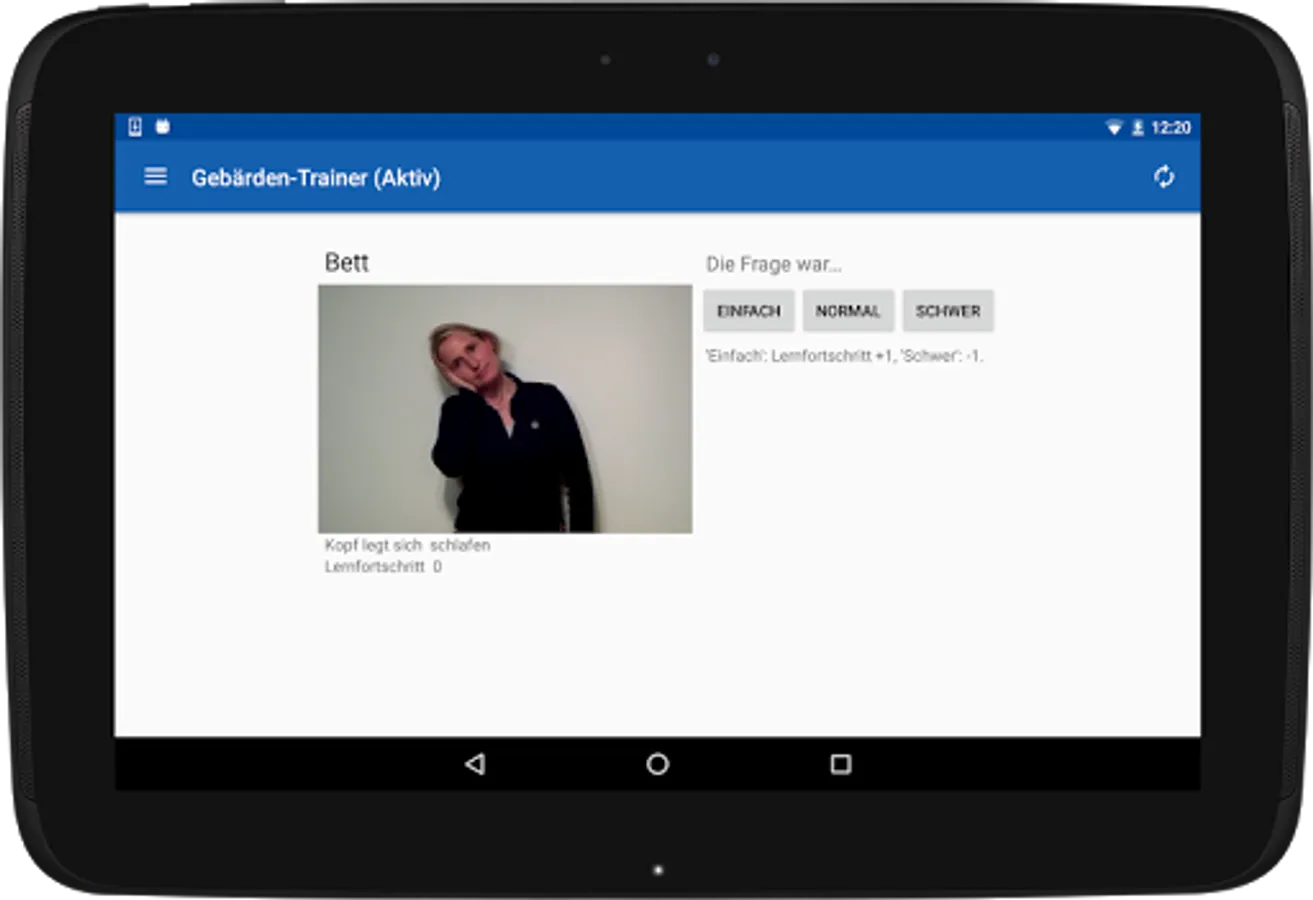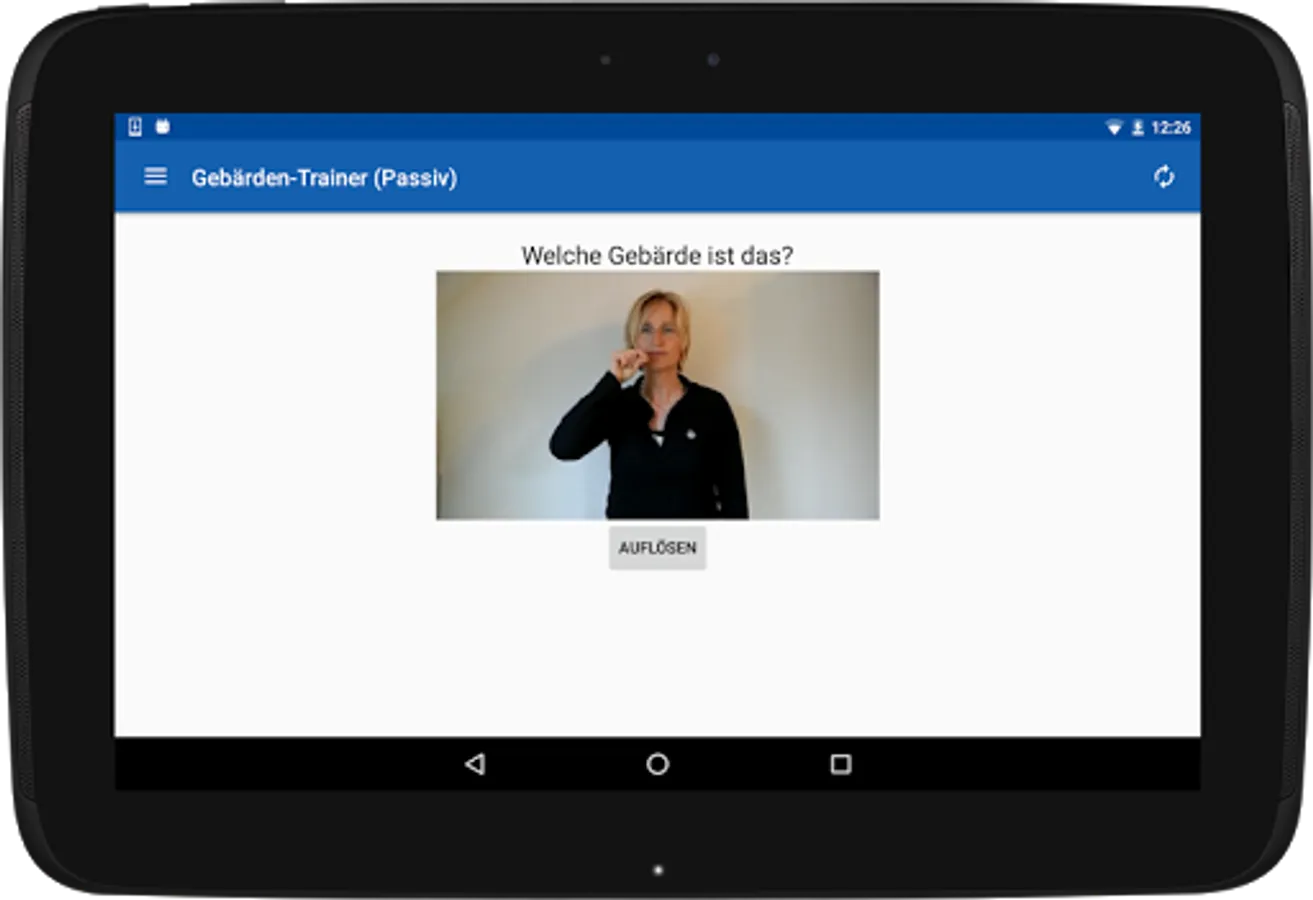 If you would like to learn the signs with the trainer, we recommend using the passive mode first. Here you get videos of signs played and then you have to answer which sign it was. Then you have to rate how difficult you found this question. This increases or decreases your learning progress for this sign. Signs that are difficult for you to answer will be shown more often. The active mode works the other way round: Here you have to make the sign yourself and then use the video to check whether you were right.