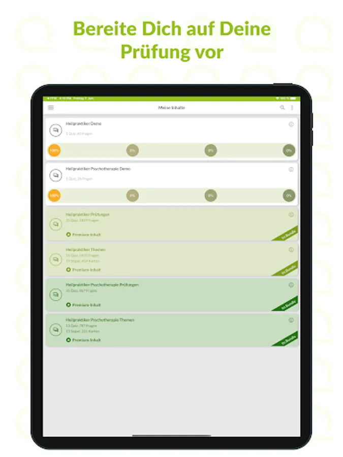 You get an evaluation of their current state of knowledge on the basis of already answered questions from you. The data stored in the app exam questions are adjusted each year to the available questionnaire and have to be paid extra NOT !! The tests from October 2017 are included in the PRO version !!!