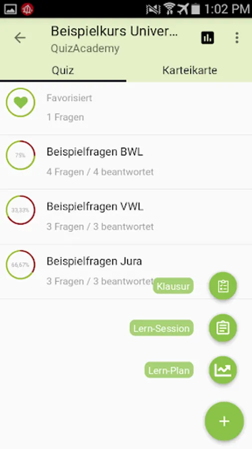 With QuizAcademy you can learn the teaching content of your professors and lecturers, prepared as quizzes and index cards, anytime, anywhere (including offline). The focus of our learning platform is to provide you with functions for learning that will help you learn and be fun. For example, you can use QuizAcademy to put together your own learning session and only learn what you want to learn. Or you can use our learning plan, which uses an intelligent algorithm to tell you what you should learn so that you can master your content until the exam. In addition to some gamification modes, we also offer a live quiz function and an e-exam function that can be used directly in the classroom. Extensive analyzes allow you to monitor your learning progress and identify problem areas at an early stage.