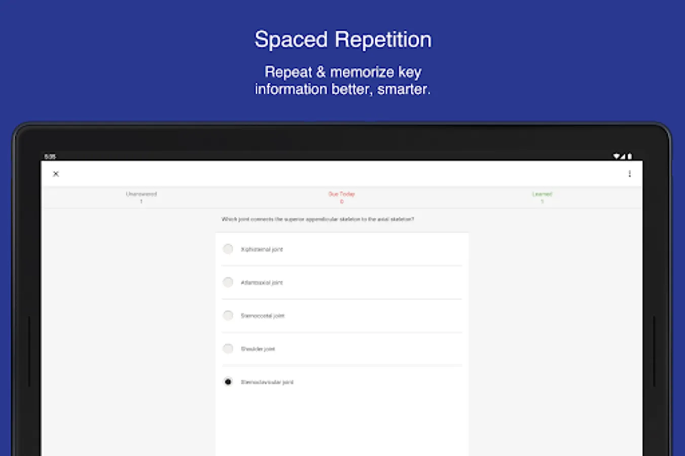 - Spaced Repetition Quiz: reinforce knowledge, driven by a smart learning algorithm