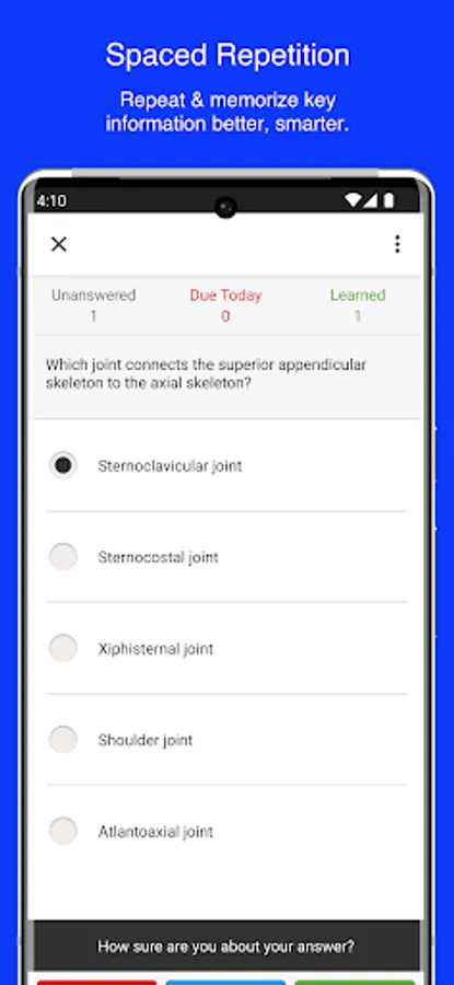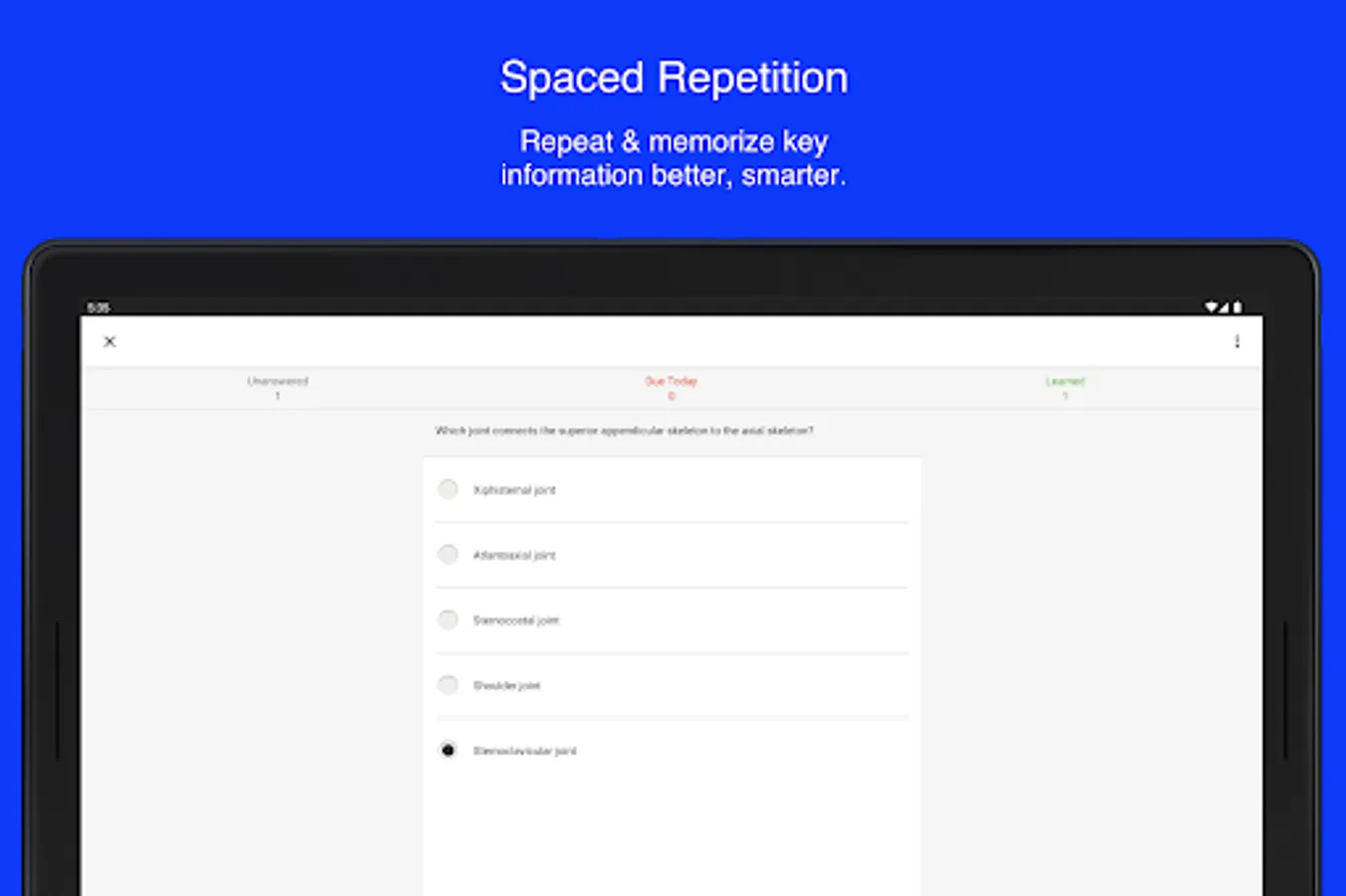 - Spaced Repetition Quiz: reinforce knowledge, driven by a smart learning algorithm