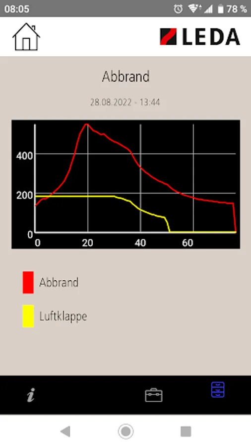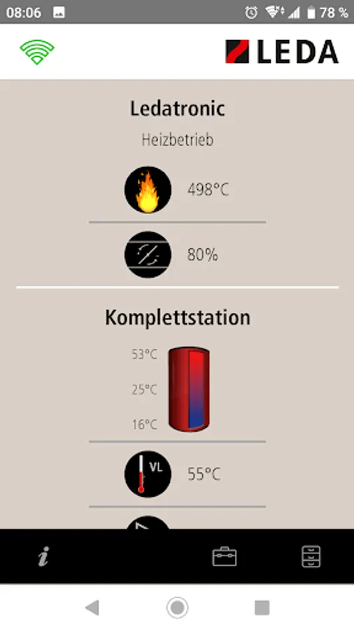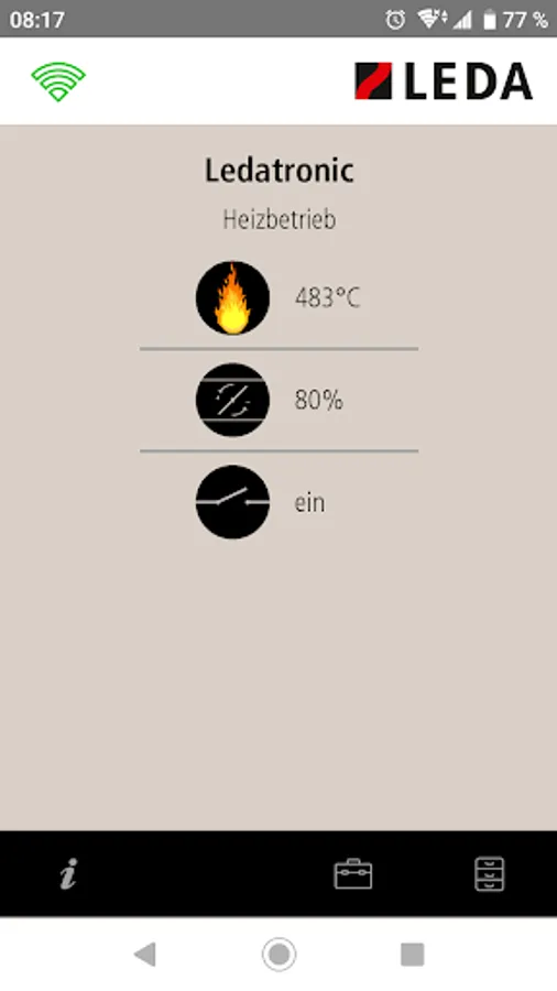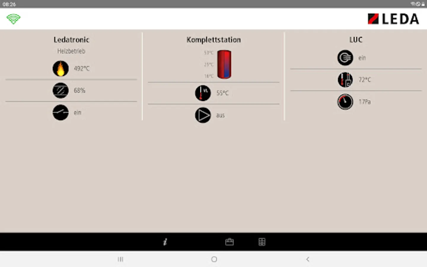 With this free app for smartphones and tablets all information and functions of the LEDATRONIC WiFi combustion air control for LEDA stoves, heating and fireplace inserts can be displayed. If additional LEDA components are connected to the LEDATRONIC WiFi, such as the vacuum controller LUC2, the complete station KS04 or the central connection unit ZAE, these are automatically initialized and displayed.