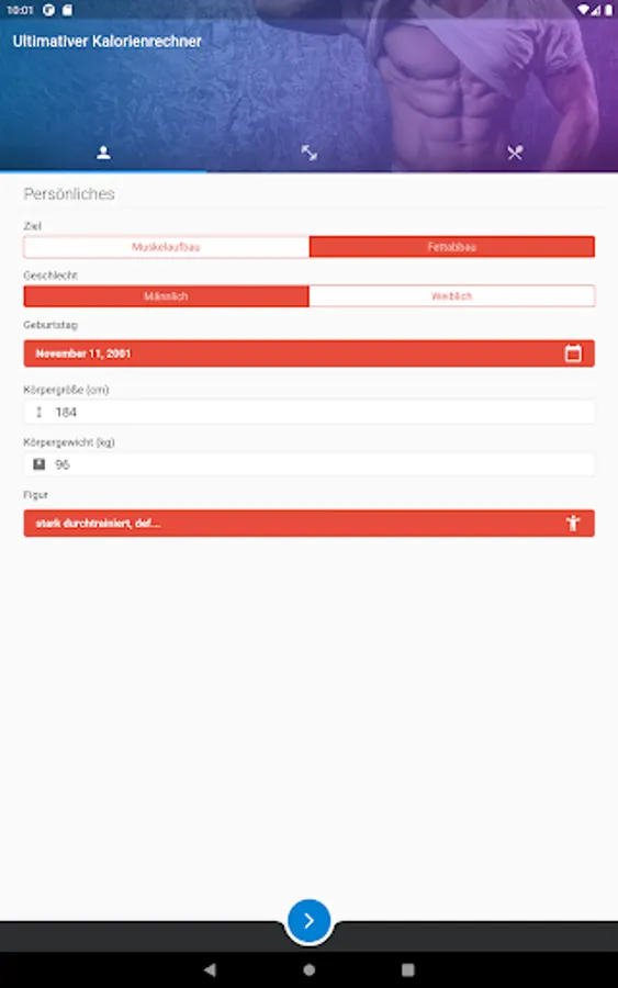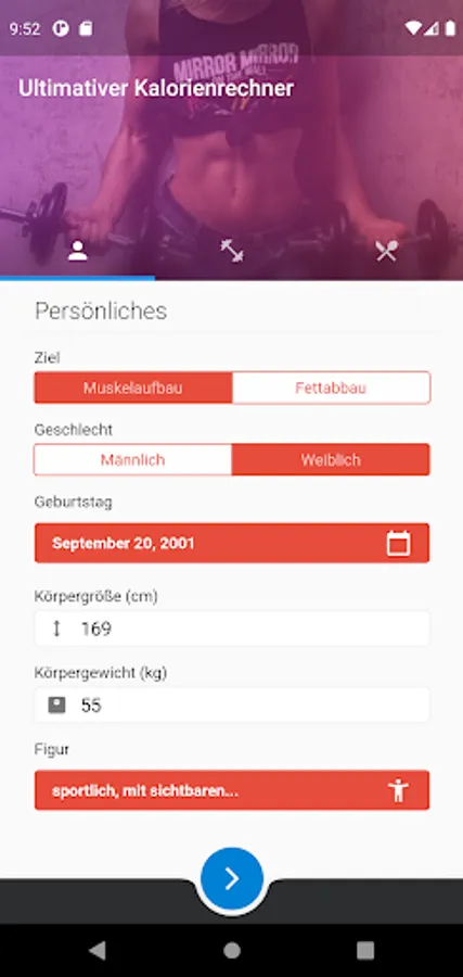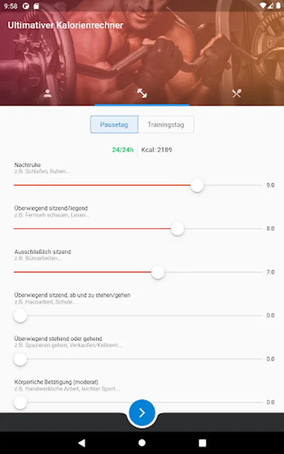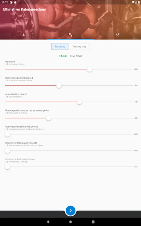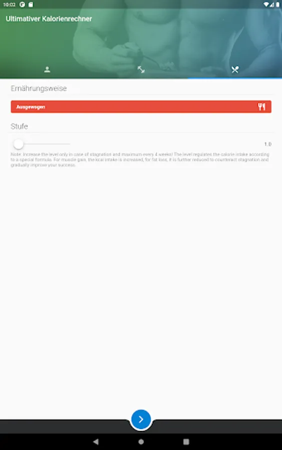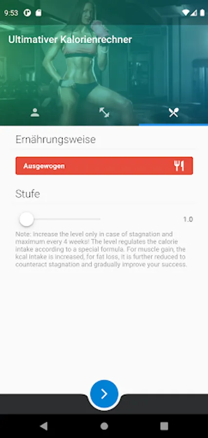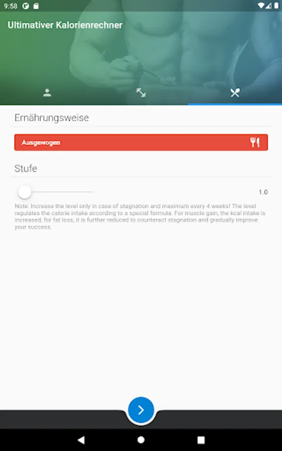 The ultimate calorie calculator allows the athlete not only to choose his nutrition form (Balanced, LowCarb, HighCarb, LowFat, HighProtein), but also to specify an individual level, with which you can individually adjust the specifications in case of stagnation.