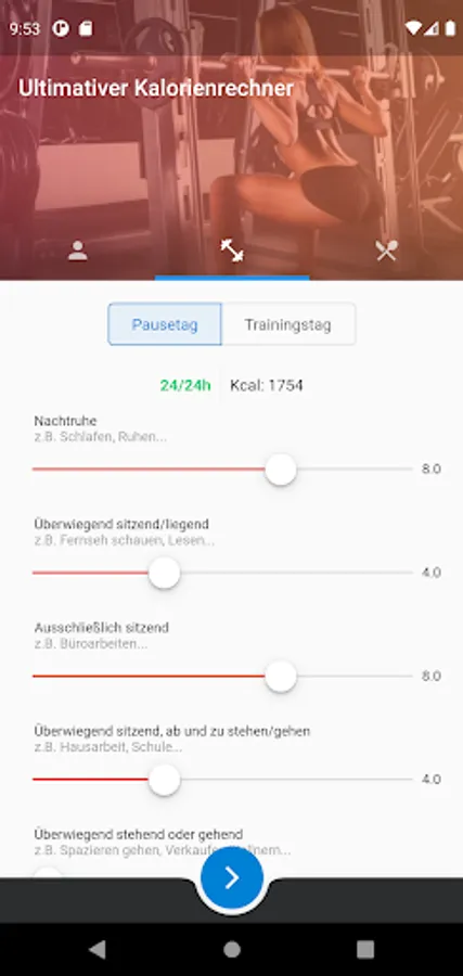 The ultimate calorie calculator on the other hand calculates the total metabolic rate according to the 24h activities. So you have to fill in more, but you get a much more accurate result - which even the comparison with activity stackers (e.g. Fitbit) confirms.