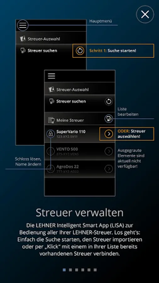 The LEHNER Intelligent Smart App (LISA) for operating all your LEHNER spreaders. LISA has two operating modes: manual mode and auto-dose. Manual mode offers maximum flexibility and auto-dose offers maximum convenience. With LISA, you can conveniently adjust settings and view machine parameters. No more laying control cables. Simply connect LISA to your LEHNER spreader and you're ready to go.