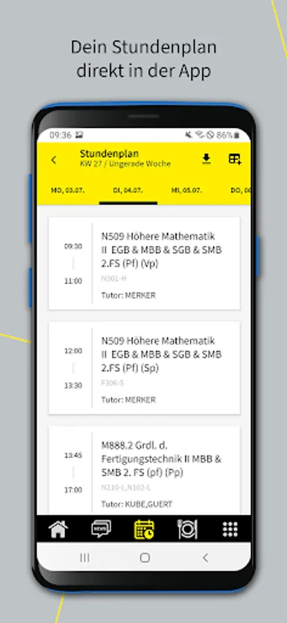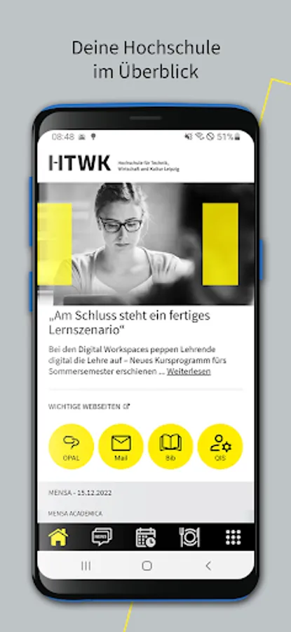 • Start page: The most important information at a glance - The top news from HTWK | The current offer of the favorite cafeteria | Title, time and place of the next course from the timetable