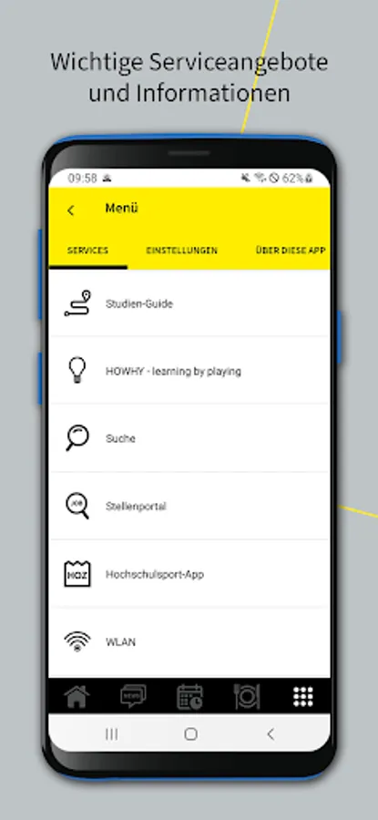 • Services: OPAL | Study Guide | Timetable | Job portal | University Library | Corona information | WLAN | Feedback on the app