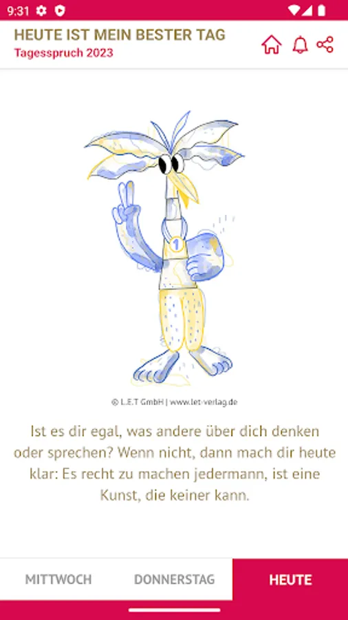 Every day of the year, this unique daily saying app provides you with an inspiring, easy-to-implement thought impulse that helps you to think more optimistically, act more energetically and live more successfully. All daily sayings from the daily sayings calendar "TODAY is my best day" 2023. Your daily saying for more joie de vivre and motivation. Share this saying with your friends too.
