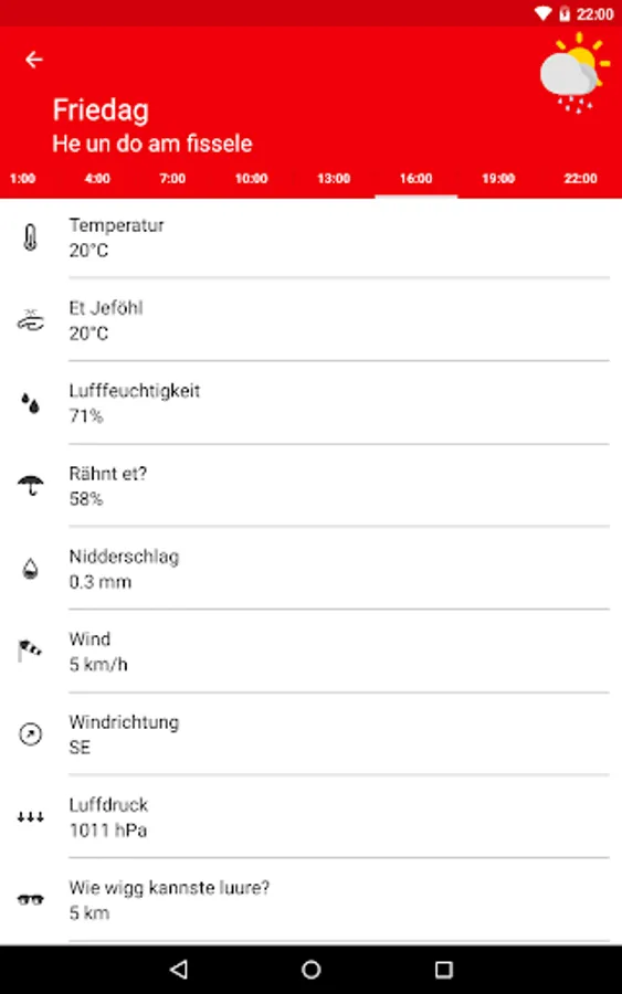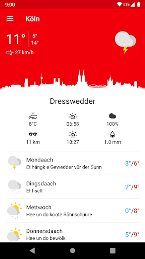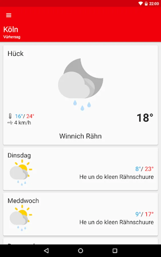 Üvverall op dr world jitt et Kölsche and üvverall op dr world jitt et now de Kölsche-Wedder-App. Ejal ob Sonnesching, Jewölk or Rähn, with the Wedder op Kölsch the weather does not get any better, but in Dorsch's Sproch it still sounds best. Sproch is a must for every Cologne and lover. Who does not have is Düsseldorfer ;-).