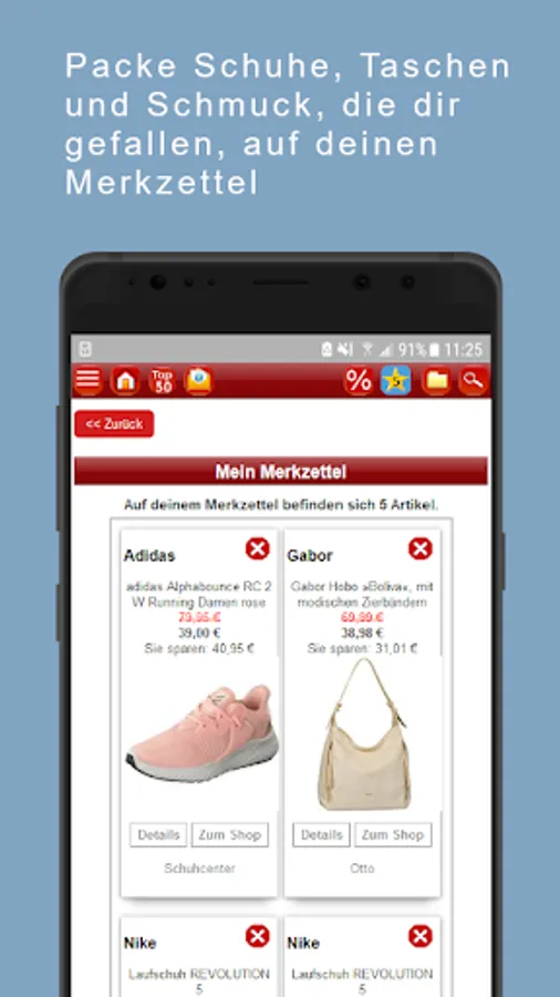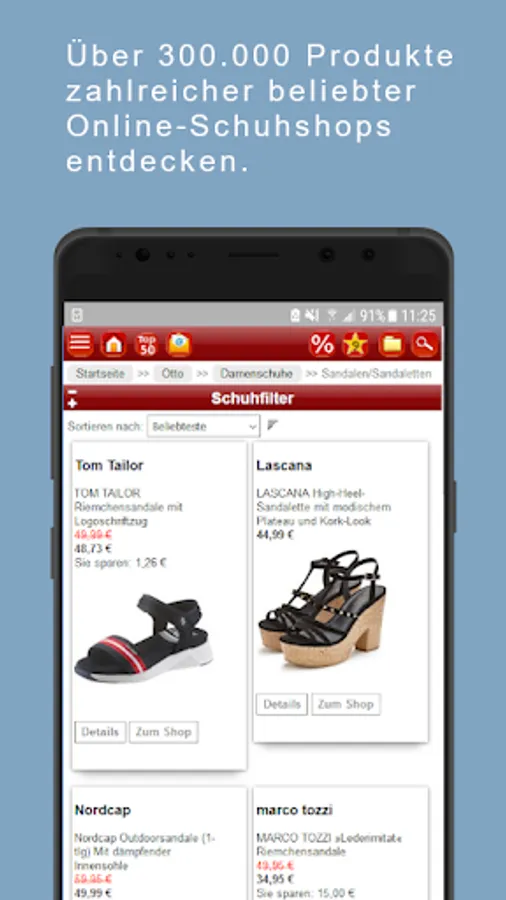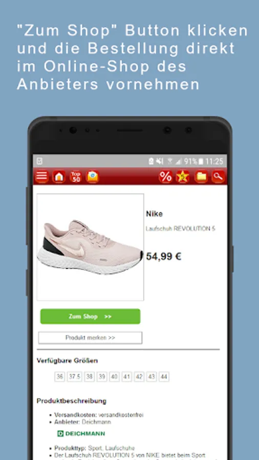 By simply tapping the "To the shop" button, you can go straight to the online shop of the respective provider (Otto, Mirapodo, Humanic, Schuhcenter, spartoo, Deichmann, etc.) and place your order.