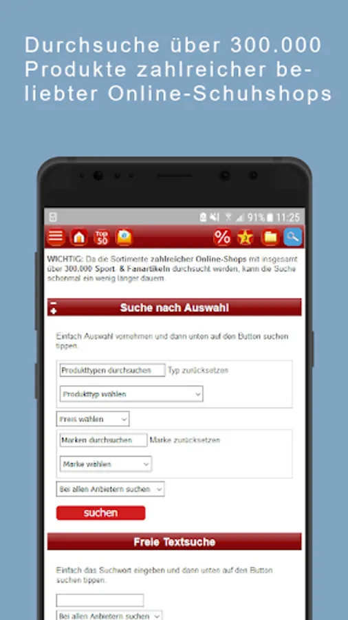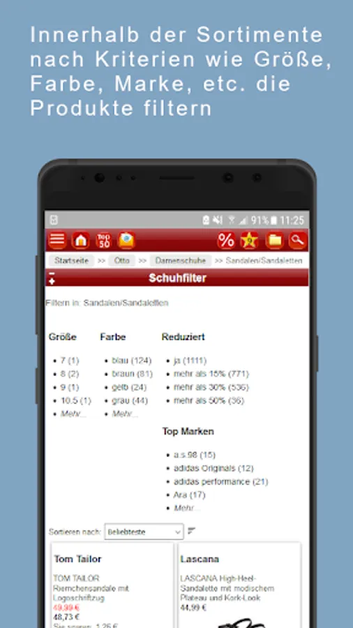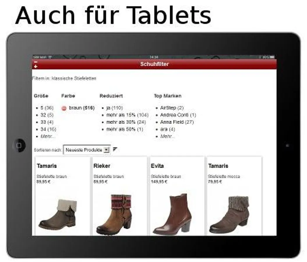 Some of the leading online shoe shops (Otto, Mirapodo, Humanic, Schuhcenter, spartoo, Deichmann etc.) under one roof or in one app.