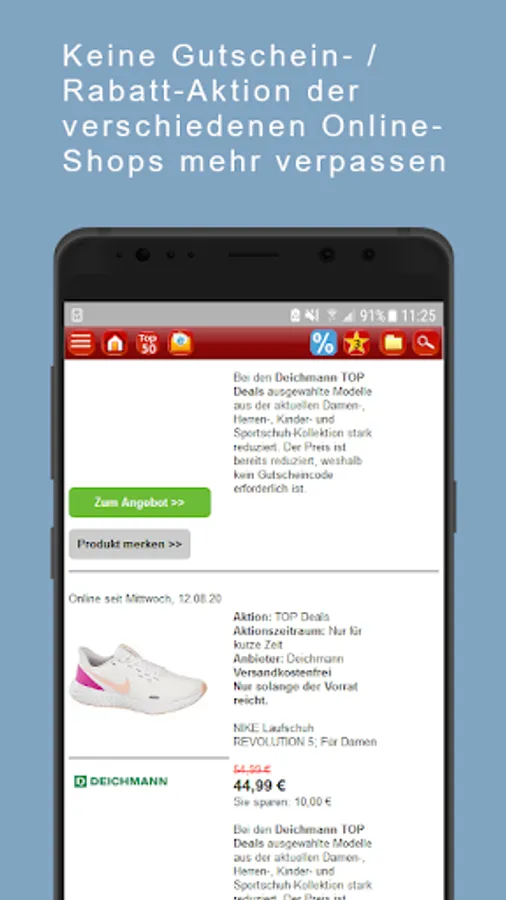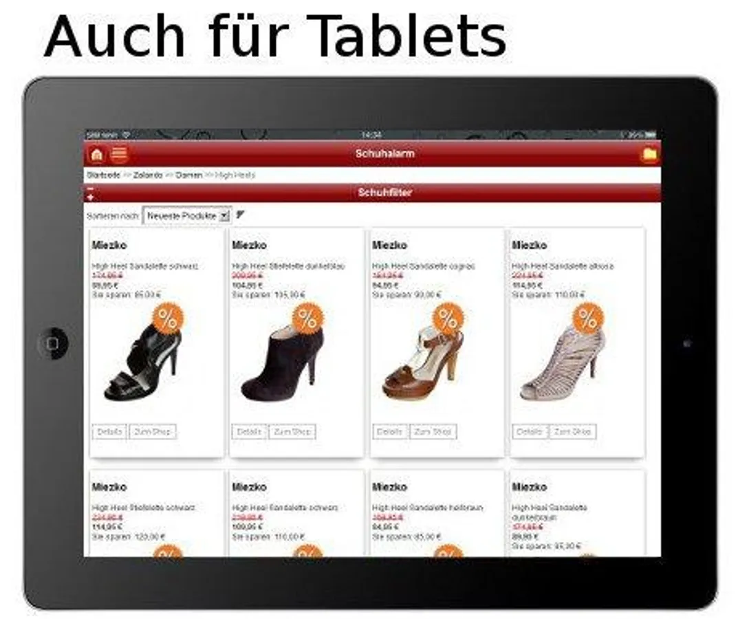 Browse through the top offers / bargains of the various online shoe shops with your smartphone or tablet from the comfort of your own home on the sofa. Shop shoes, handbags and jewelery until you drop.