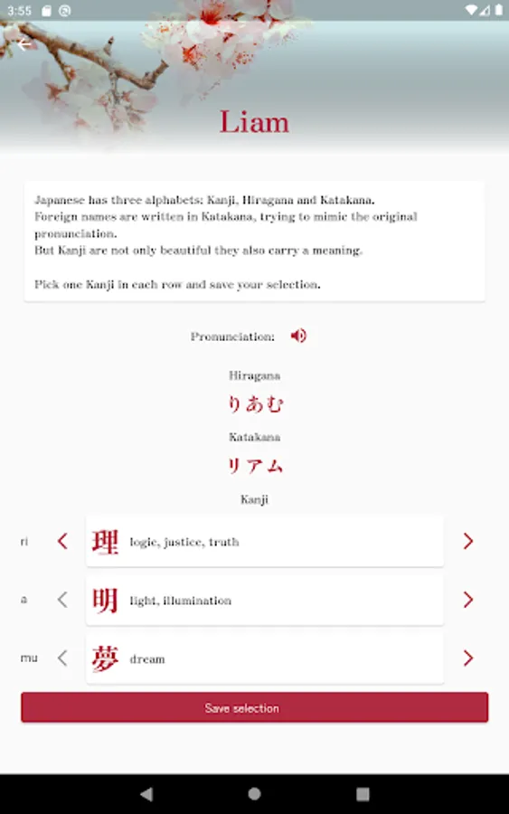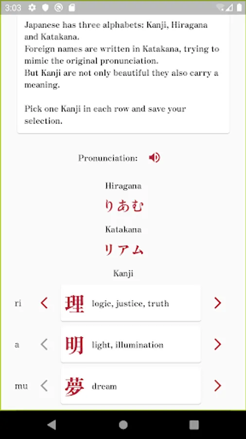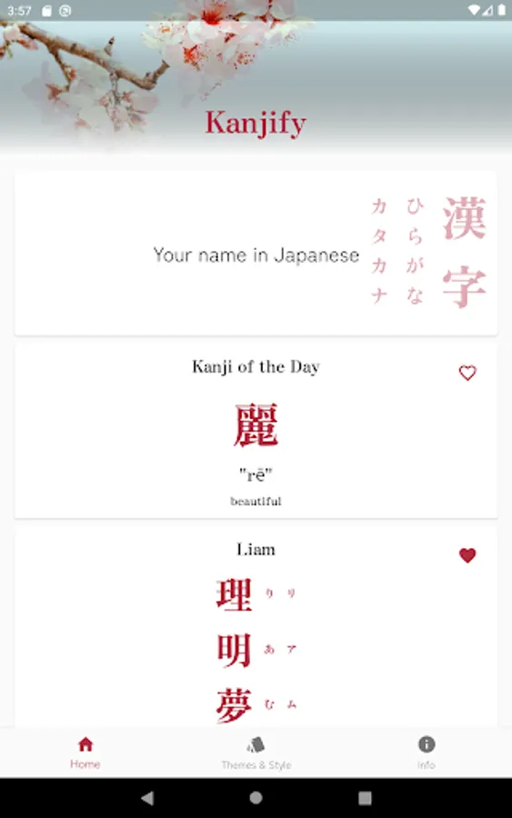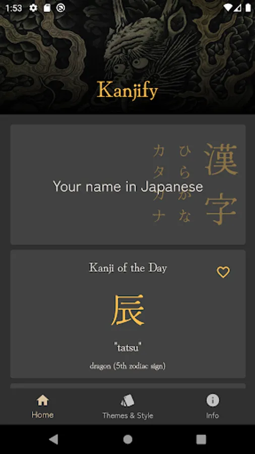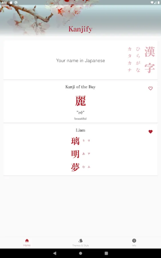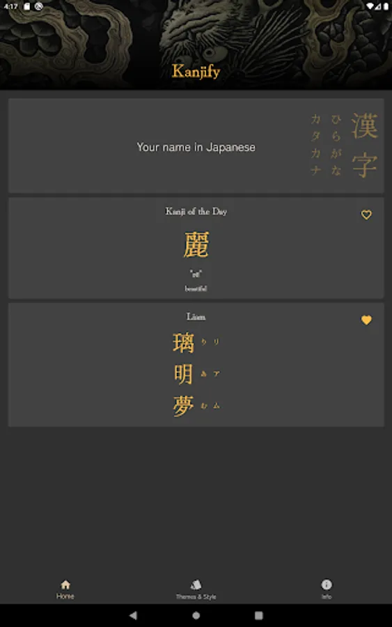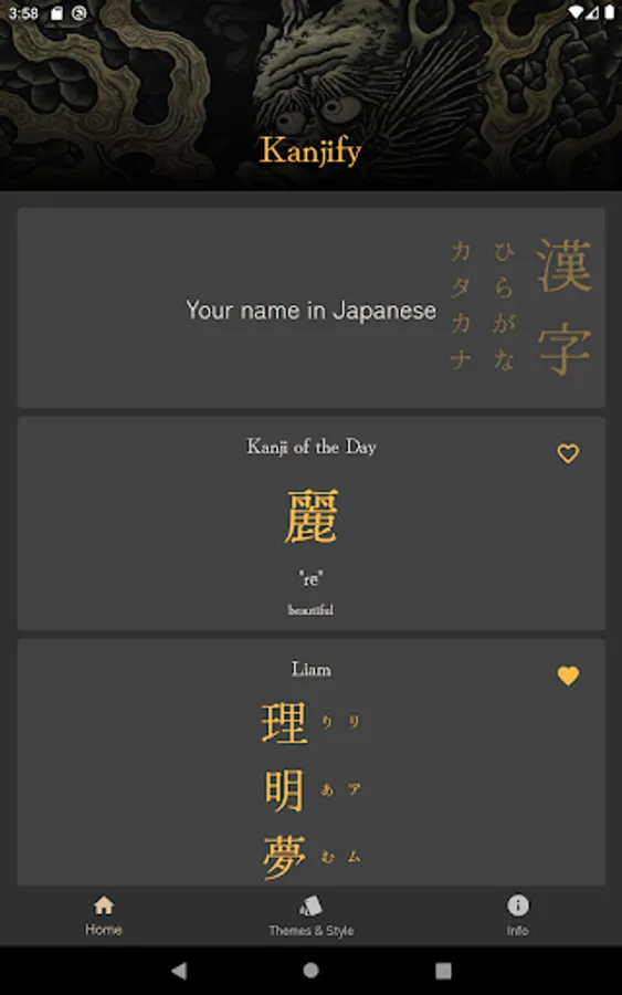 This app is designed to learn about Japanese writing in an engaging and fun way. You encounter lots of amazing Kanji and translate your and your friends names into Japanese.