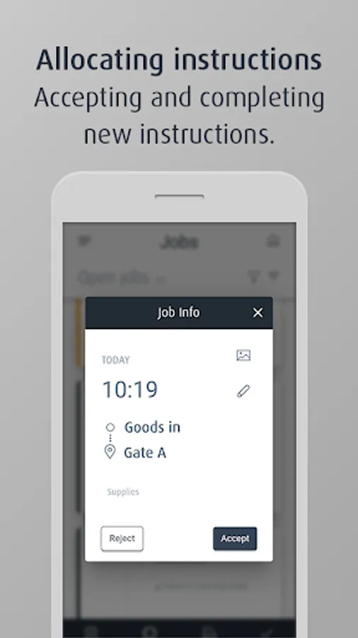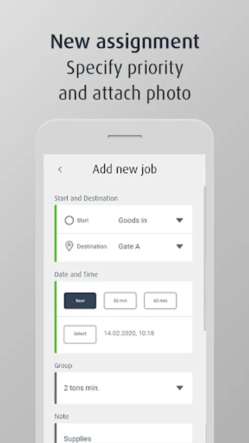 Shift supervisors can set up a new job in a few simple steps. This involves entering the location and destination of the goods and defining the priority of the job. The job can be assigned to all or a specific group of vehicles or drivers. Supervisors can choose between three time frames for job completion: Now, 30 minutes and 60 minutes. They can also attach photos, documents and comments.