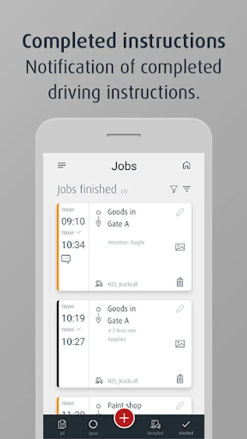 Once the driver has carried out the job, he confirms completion of the transport using the app. The shift supervisor immediately receives confirmation that the job has been successfully completed. He can also view the time of the completion and photos and notes attached by the driver.