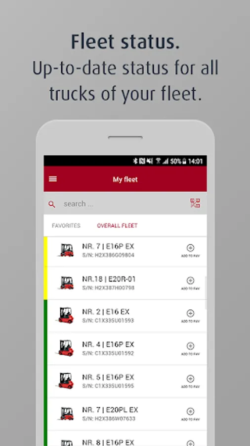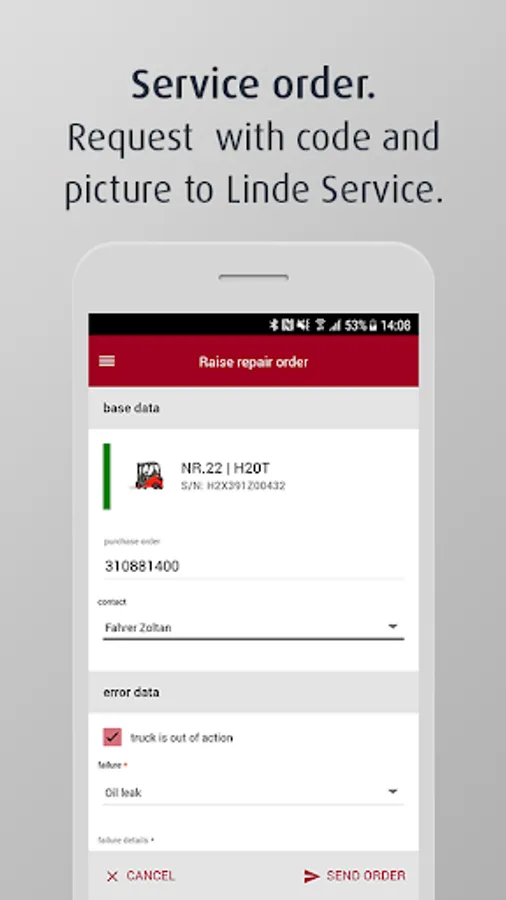 Notify your Linde Service with usage of the APP about a repair to your truck. Therefore select the affected truck out of the fleet list or you scan the QR Code directly at your truck. Choose a failure code, take a picture and send this information. Your request will be forwarded directly to your Linde Service Team in charge. Up from now you will receive the latest information to your order receiving a push- notification or Mail if you wish.