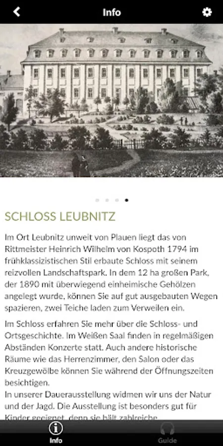 The app provides all the information for your visit - from opening hours to directions. For further service and program offers, you can be guided directly to our website. And if you liked the visit to Leubnitz Castle, you can share it directly with your friends and followers via the social media channels.