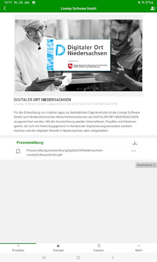 The structured documents are quickly found and displayed in the app. View the documents together with the customer or send the technical data sheets, images and PDF brochures to your contacts from the app. In addition, the sales talk can be easily documented in the LinFiles sales app. Other options are possible on request.