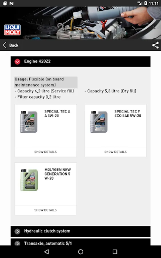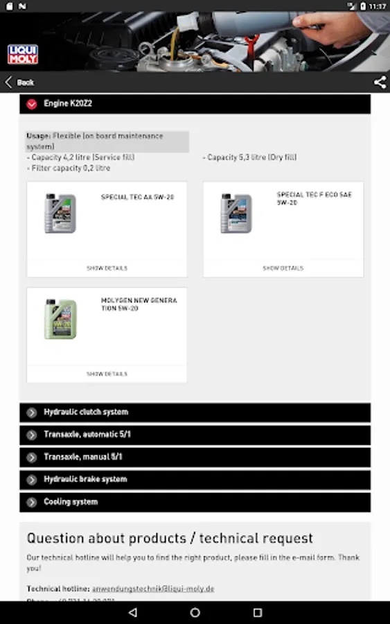 • Search for the right motor oil, gearbox oil, hydraulic oil, coolant and brake fluid for your vehicle