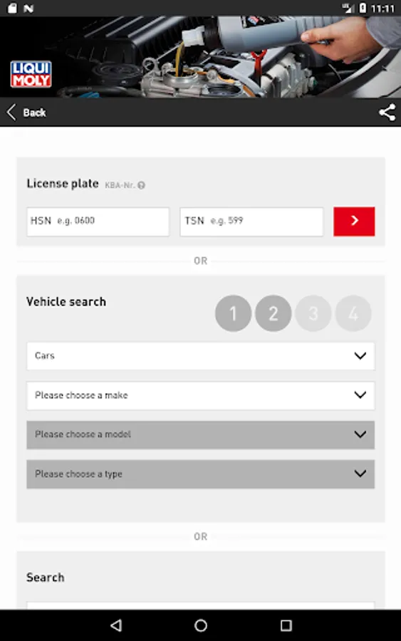 • Vehicle search via HSN/TSN (written in the vehicle registration), make > model > type or by free search