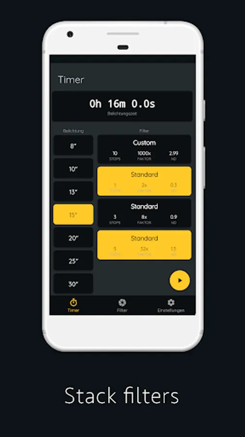 Simply specify the filters you want to use and the exposure time of the camera and ND filter calculates the optimum time span, for your photographs to become awesome.