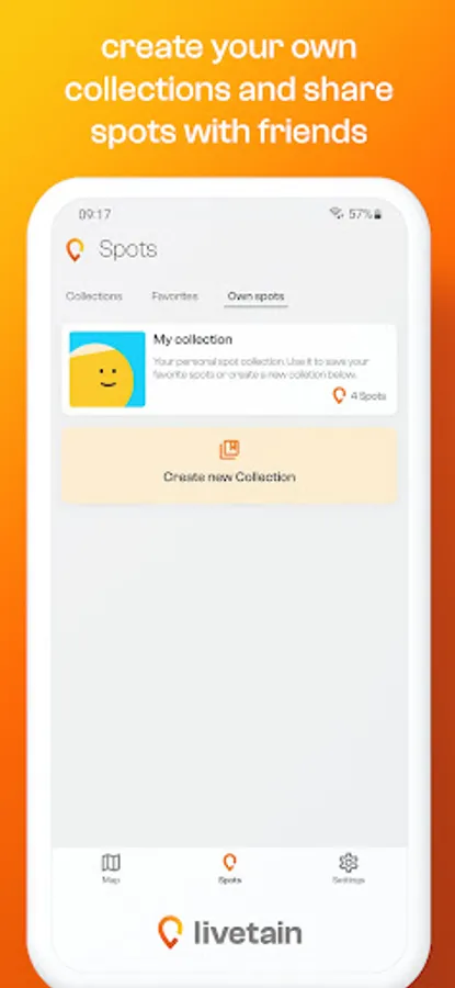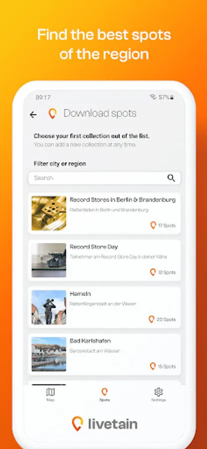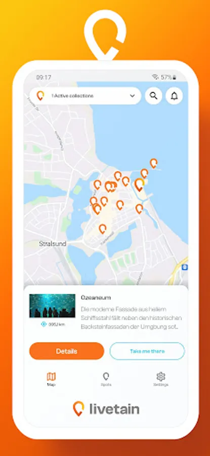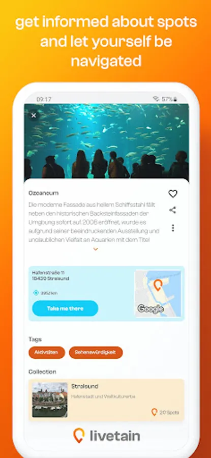 Your life is full of possibilities and ideas: funny, original, grandiose or simply important. livetain is the platform where they all have a place. Be inspired by the many spot ideas on livetain or create your own spots and share them with friends. The special feature of livetain is the monitoring: livetain actively reminds you when you get close to your favourite spots and you receive a notification in the lock screen. You can call up livetain directly via the hint and view the remembered location. The automatic connection with your navigation app shows you the way. You determine the distance at which you receive a message, depending on whether you are travelling on foot, by bike or by car.