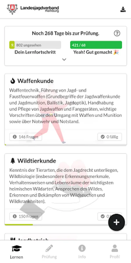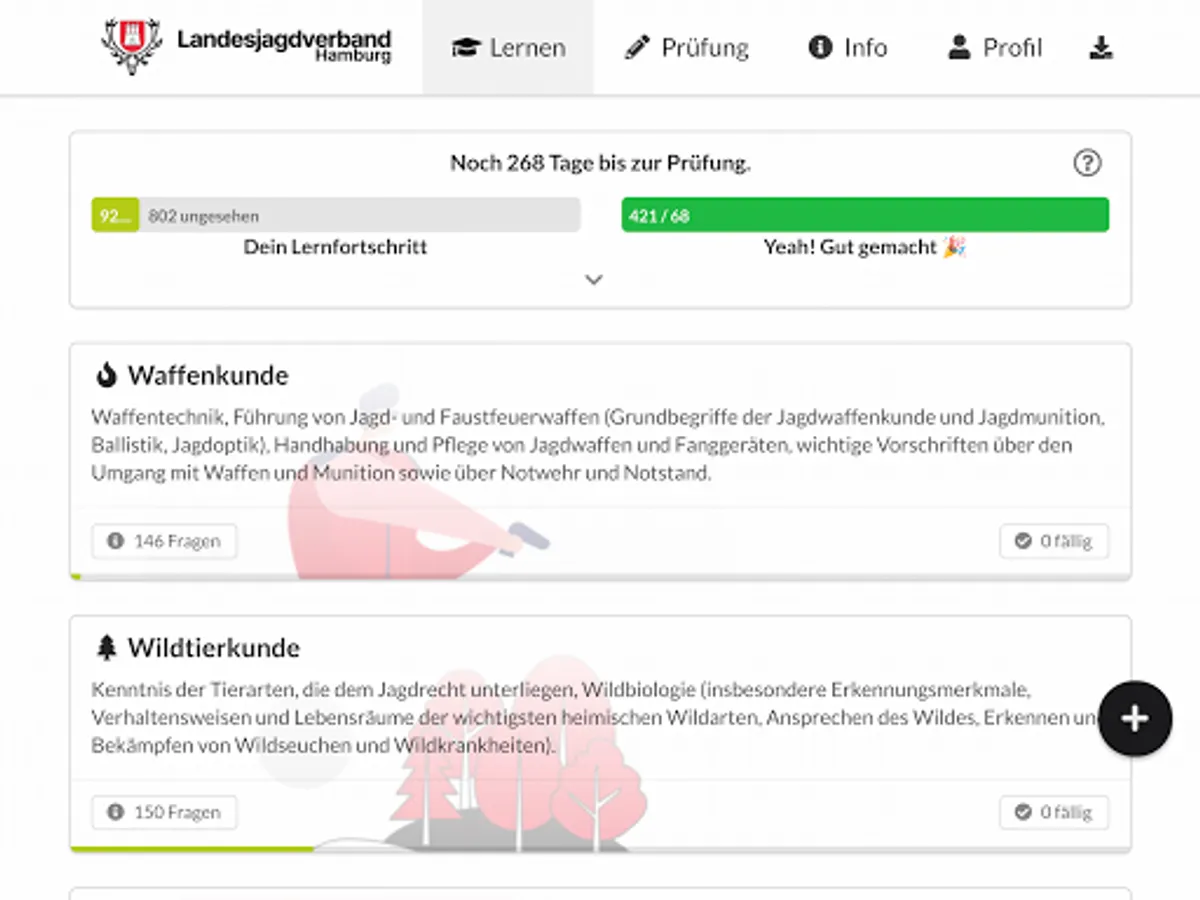 Prepare for your hunter exam with the official learning app of the Hamburg State Hunting Association. The app contains the latest and official exam questions, an intelligent learning system and an exam simulator with grade calculation. So you can prepare yourself optimally and relaxed for your hunter exam in Hamburg.