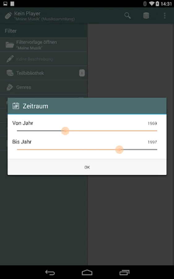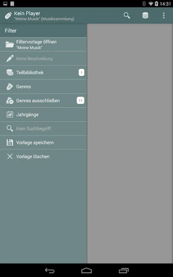 This app presents your library using a simple default layout navigating from your artists to the artists' albums and the corresponding album tracks. While this main navigation will stay the same, you can apply filter combinations to restrict the presented amount of data: