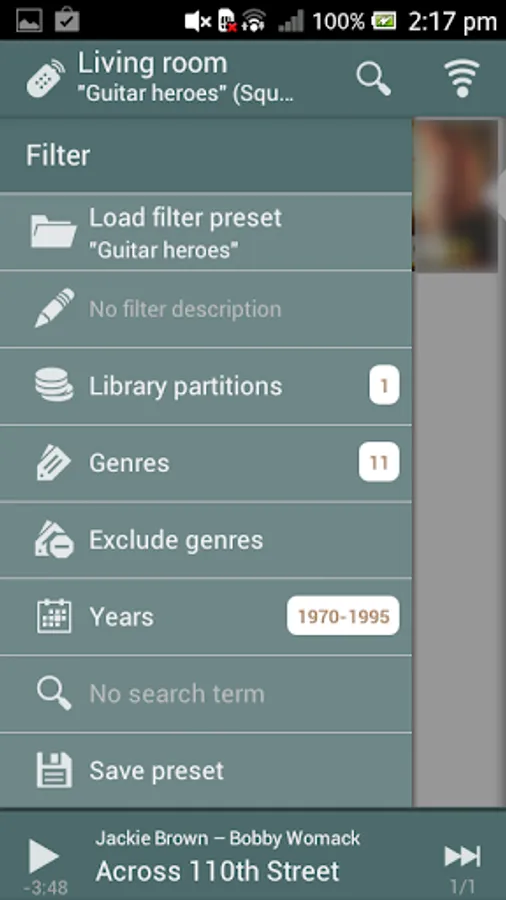 • Genres: Include or exclude any number of genres, for example showing all "Pop" and "Blues" records but excluding (the Logitech Media Server can handle multiple genres for each track) everything marked as "Christmas".