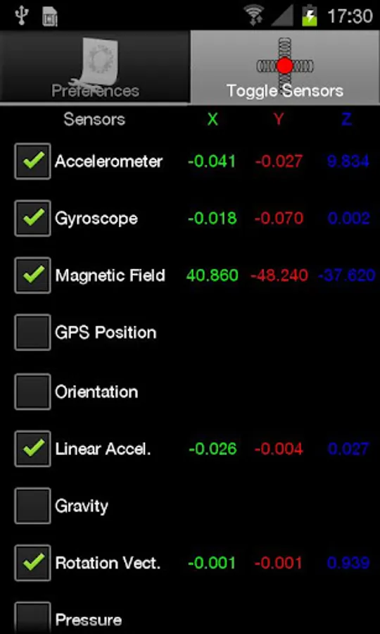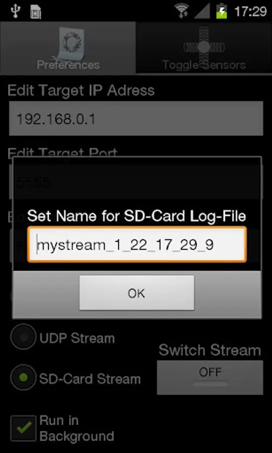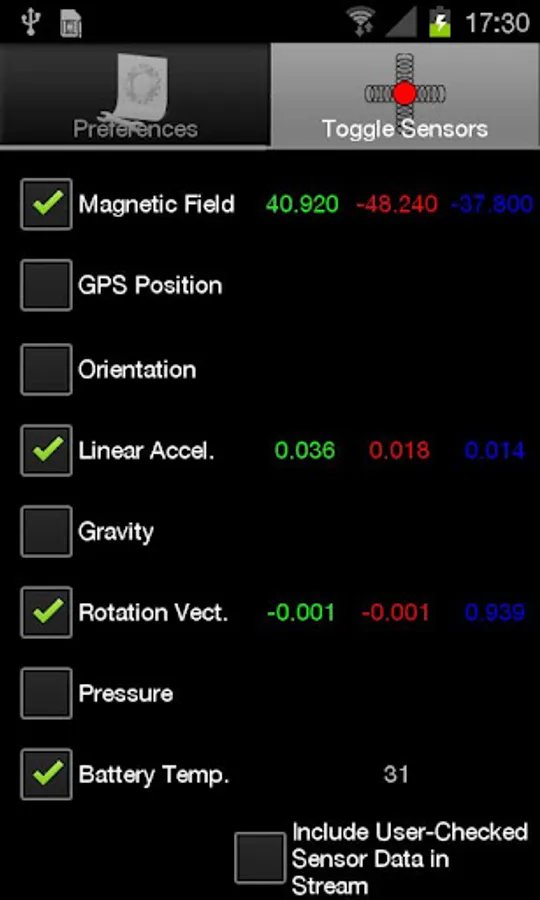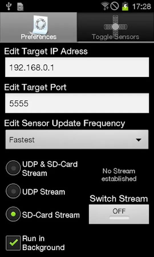 A Stream containing the Sensor-Values in CSV- Format by WLAN To a Client and/or a Stream To a SD-Card can be started and stopped. The Sensor-Update frequency can be adjusted.