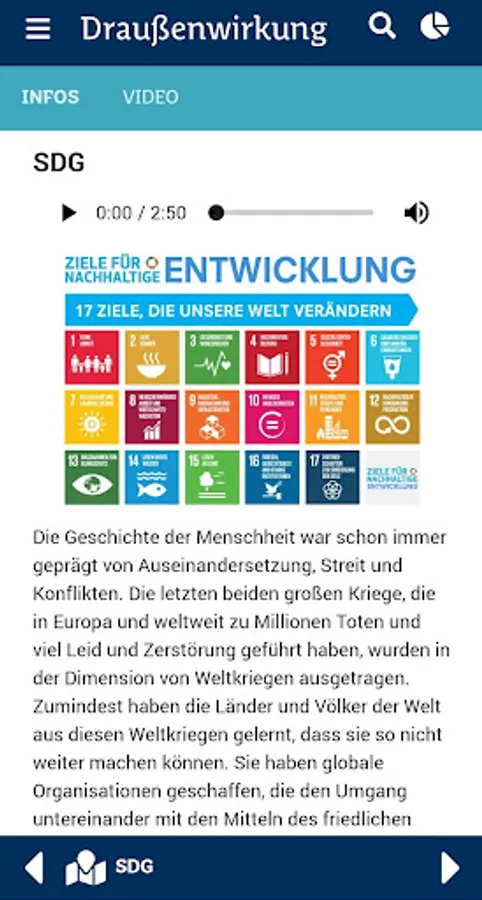 The app "Draußenwirkung" therefore aims to help teachers to treat sustainability issues during hiking days. It was published by the Center for Education for Sustainable Development (ESD) and the working group "Nature and Zoopedagogics" of the State Institute for Education and Media as well as the state coordination of the Saarland Saarland Ministry of Education. The app contains a wealth of information on planning and implementing hiking days with ESD priorities: In addition to basic knowledge of ESD, Global Learning and the Global Sustainability Goals, there is an overview of the educational offerings from over 40 out-of-school learning venues, with contact details and route planning tools for the hiking day , Also practical proposals for a "day out" with concrete (game and action) ideas for forest and meadow as well as consumption-critical city tours, which are constructed as digitally guided routes for all district towns and provide treasure hunts with materials and quizzes, help to design a hiking day sustainability effect.