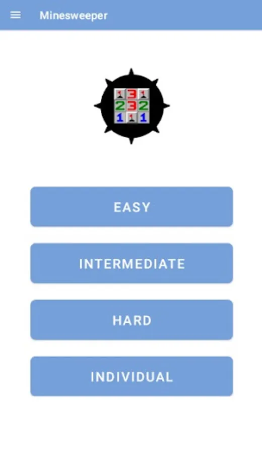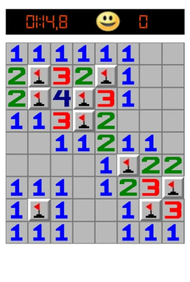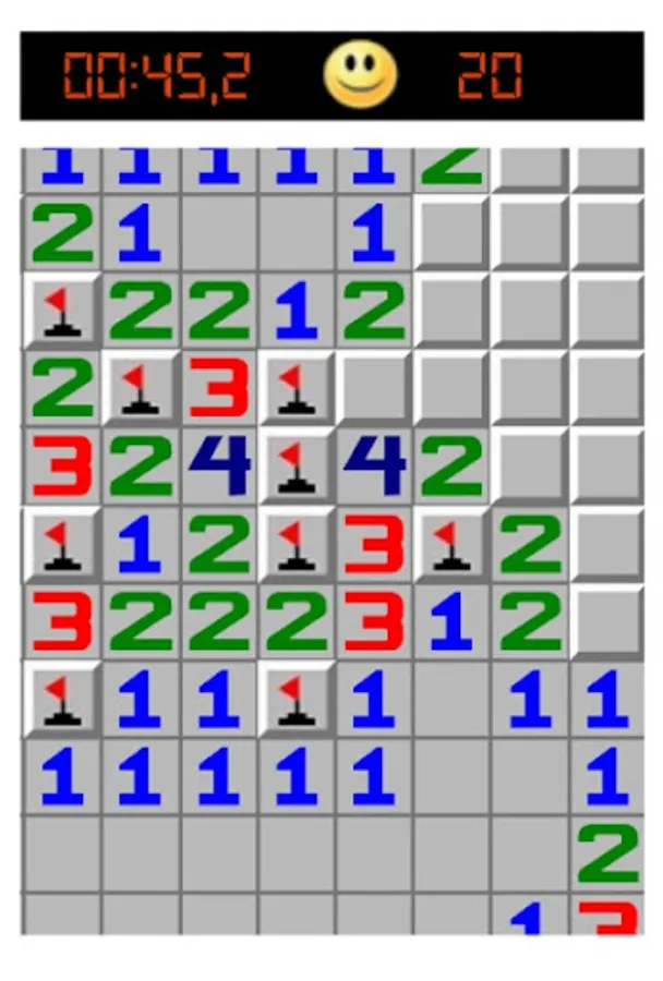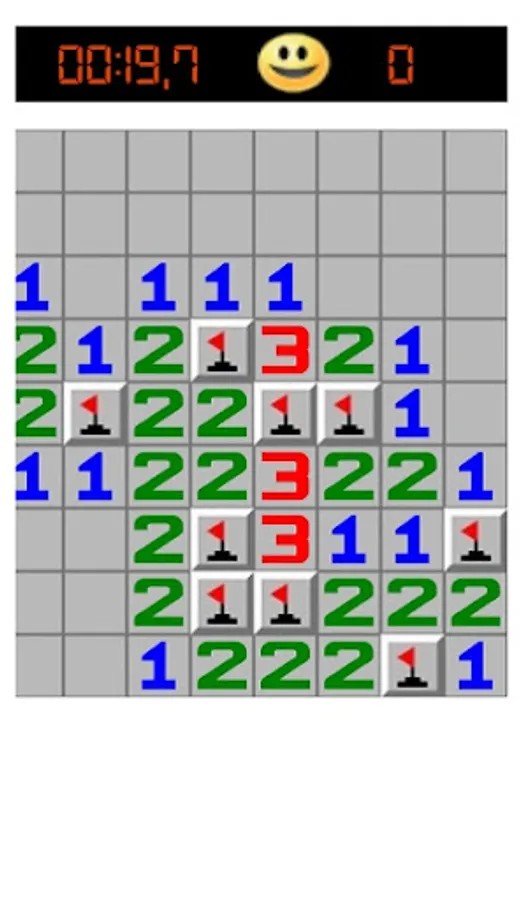 The user can choose between the difficulty levels Easy (9 x 9 fields, 10 mines), Advanced (16 x 16 fields, 40 mines) and Hard (30 x 16 fields, 99 mines). In addition, the user has the option to set the number of fields and mines individually. The player's goal is to identify all the fields with mines without clicking on them.