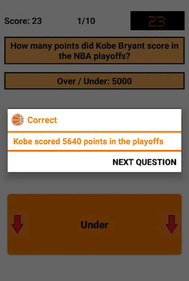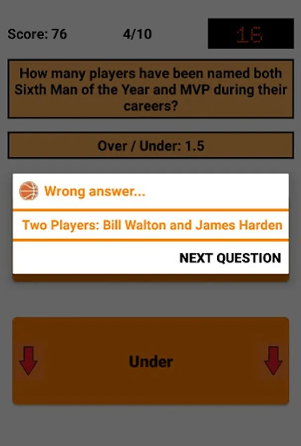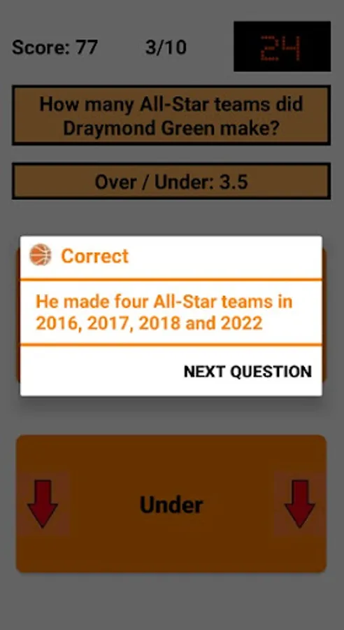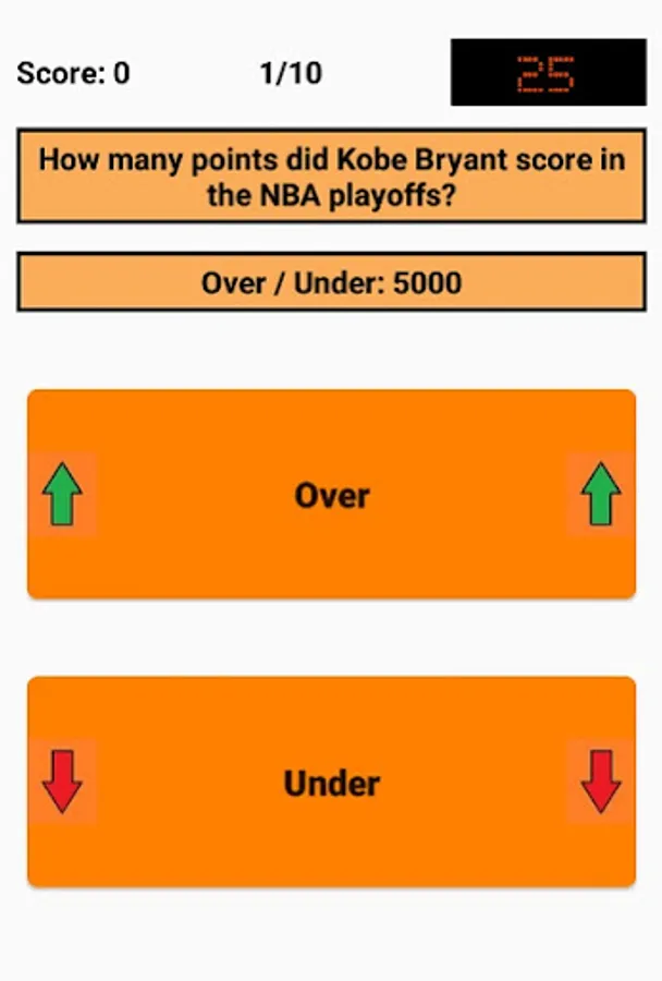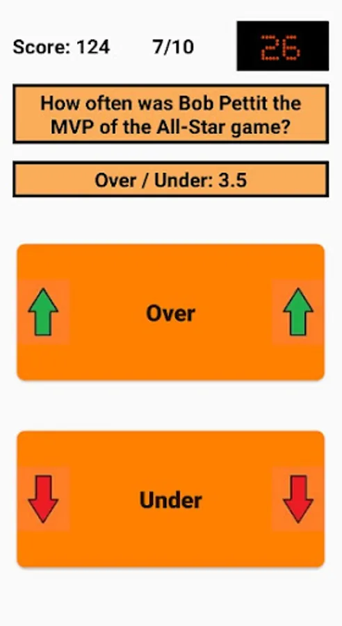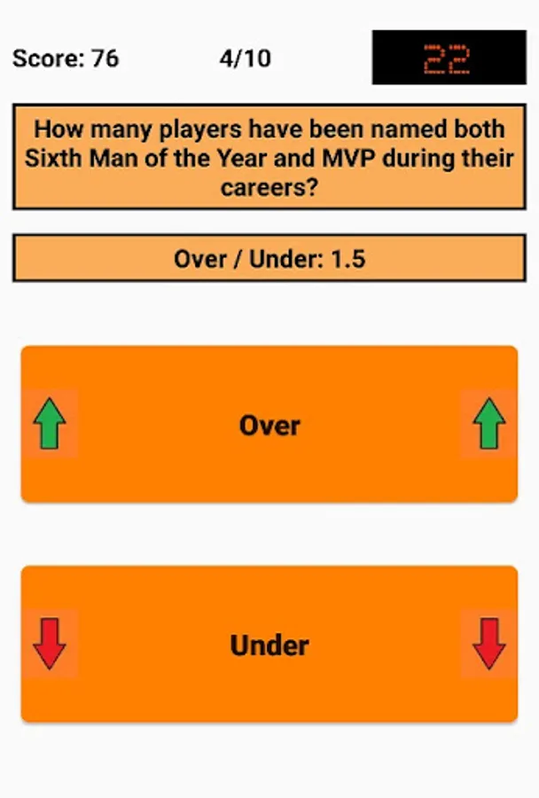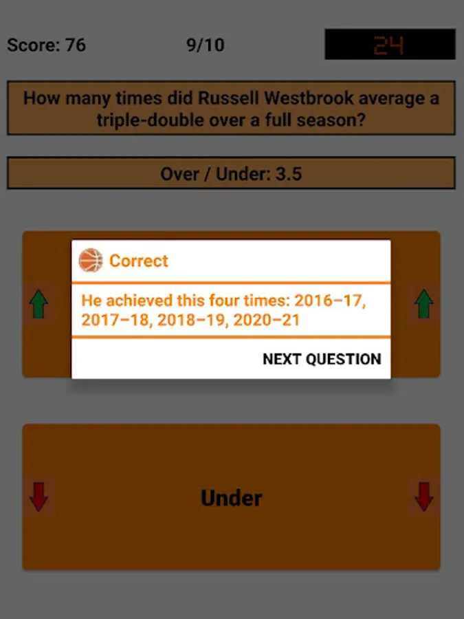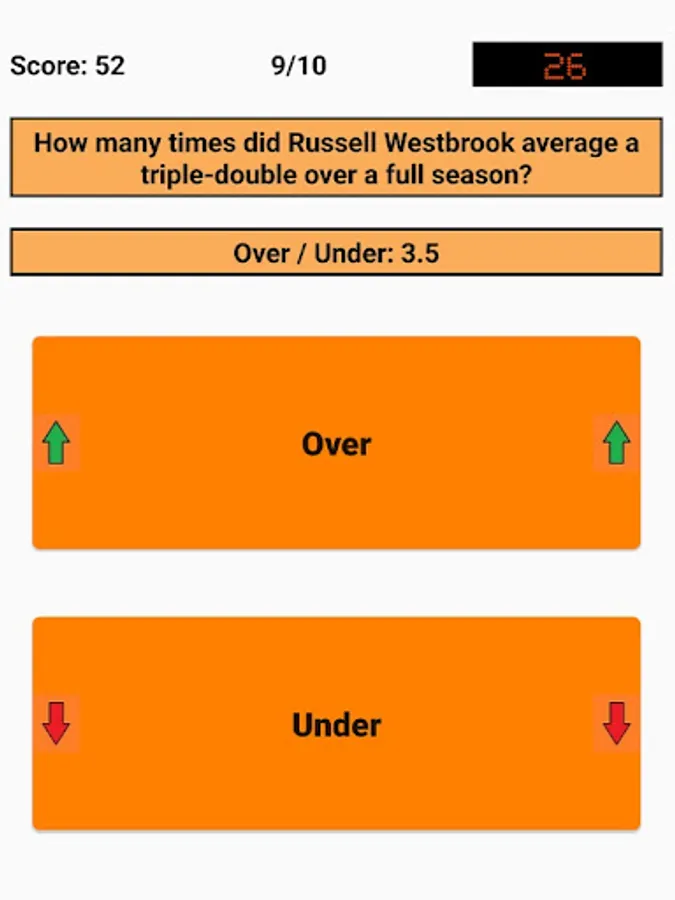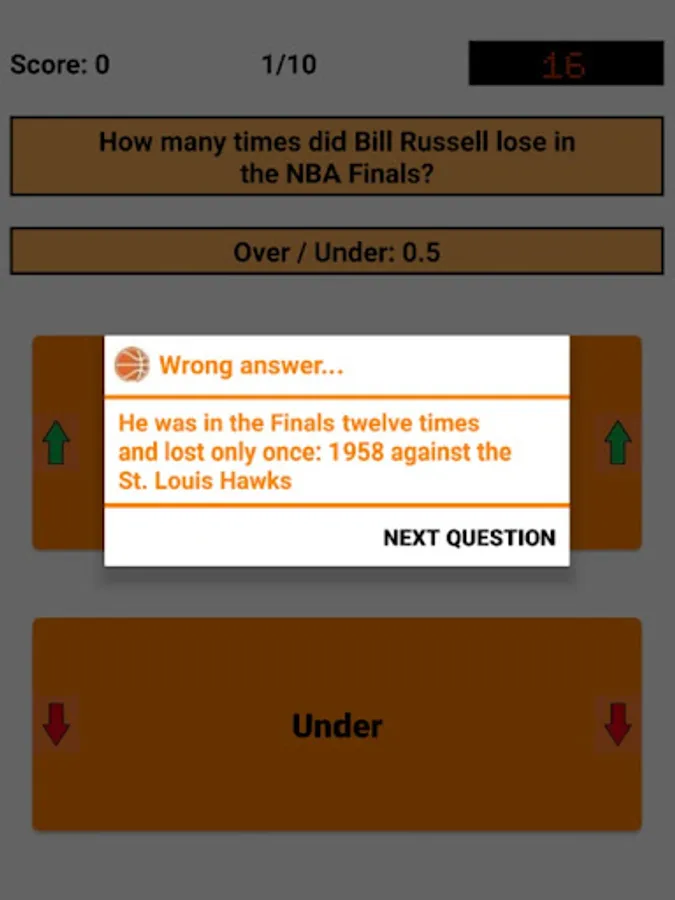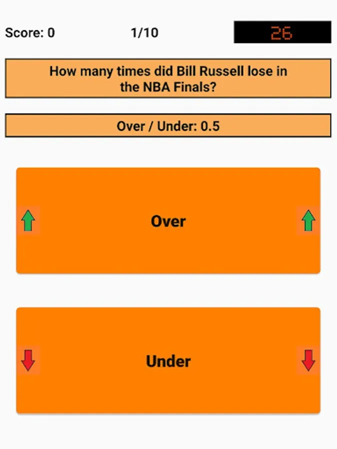 An Over/Under is given and the user has to decide whether the correct answer is above (Over) or below (Under) that. Decimal places (.5) are used here because the answer is always above or below, but is never exactly the same as the Over/Under. For example, if the question is "How many titles has Bill Russell won as a player?" and the Over/Under is 9.5, the user has to decide whether the number of titles is above (minimum 10 titles) or below (maximum 9 titles). In this case, Bill Russell has won 11 titles, so the correct answer is "Over".