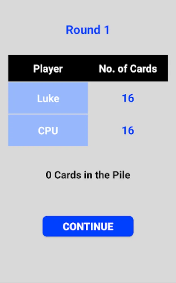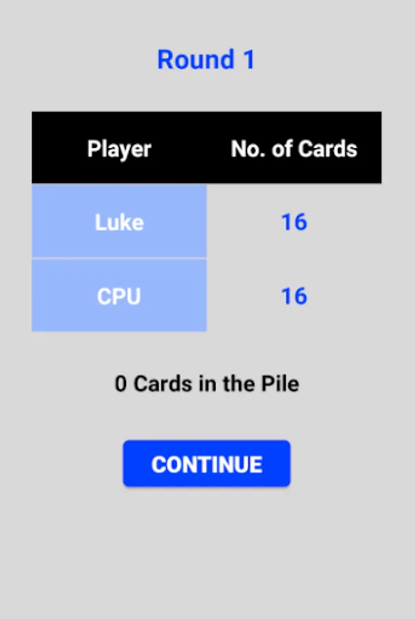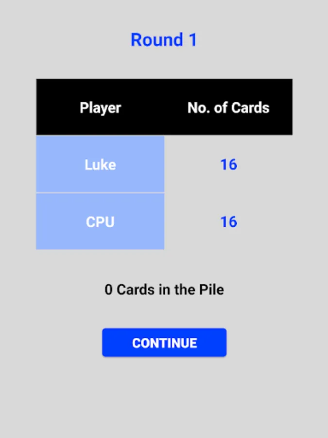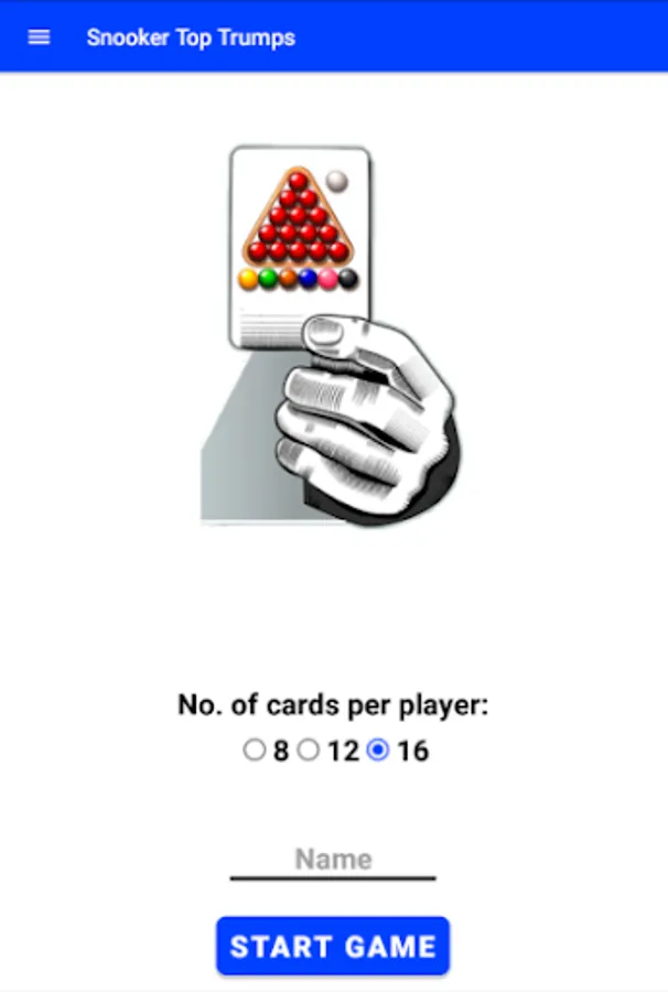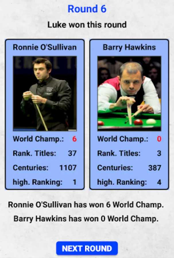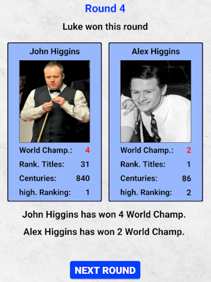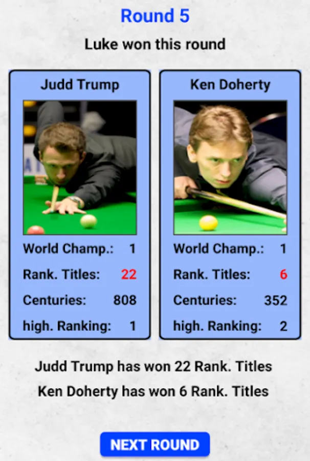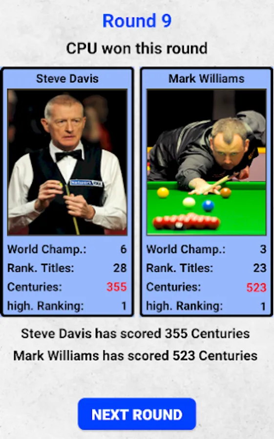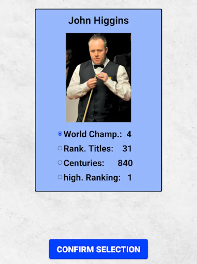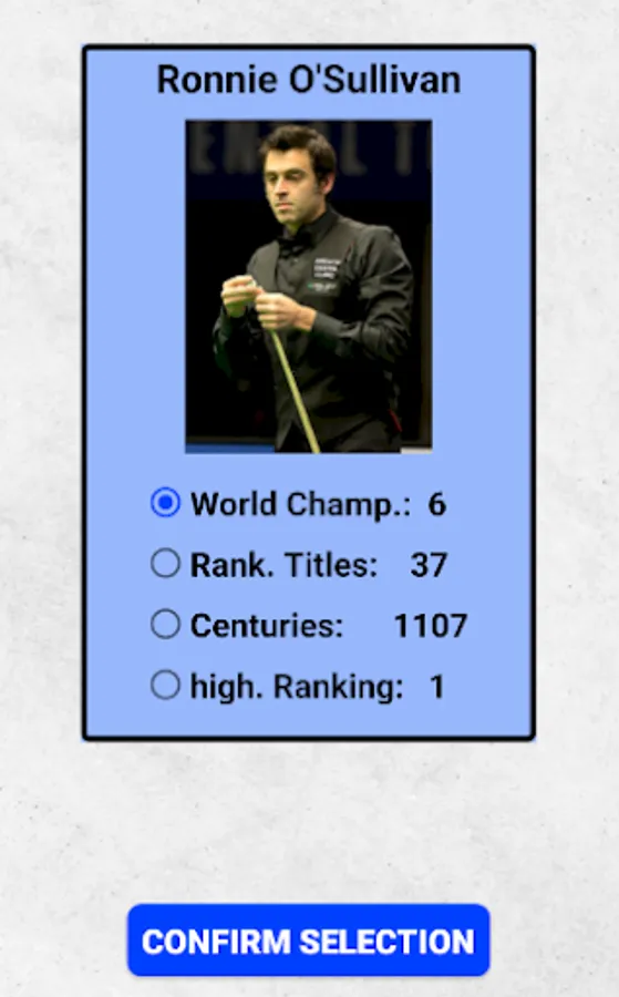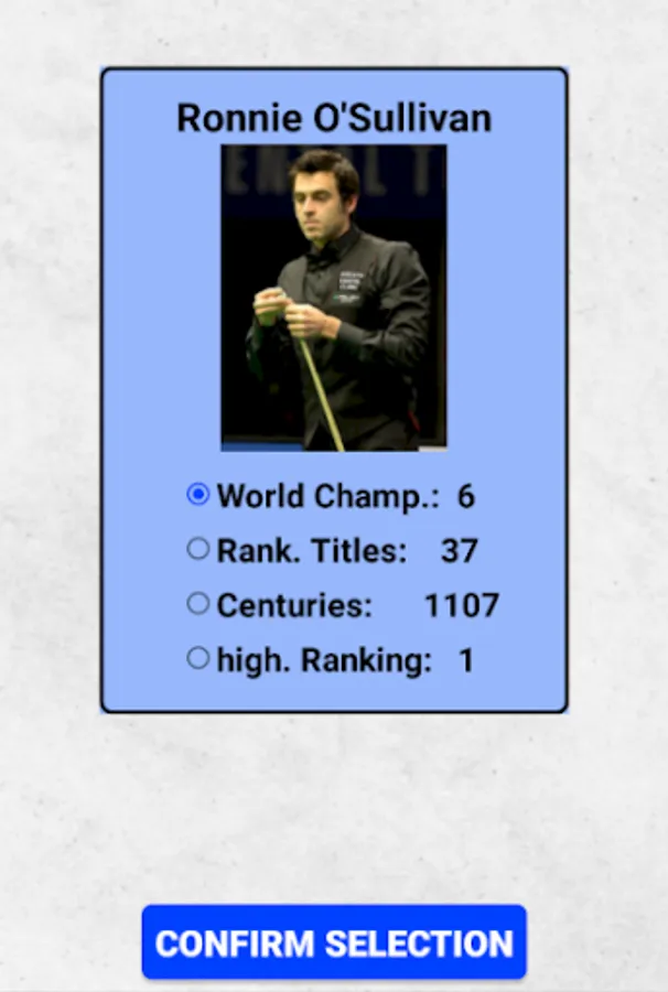 Each card has four categories: Number of World Championships (World Champ.), Number of Ranking Titles (Rank. Titles), Number of Century Breaks (Centuries) and the highest Ranking in the player's career (high. Ranking). For all four categories except "high. Ranking", the higher value wins. Each player receives 16 cards at the beginning (or 8/12, the user can choose this at the beginning).
