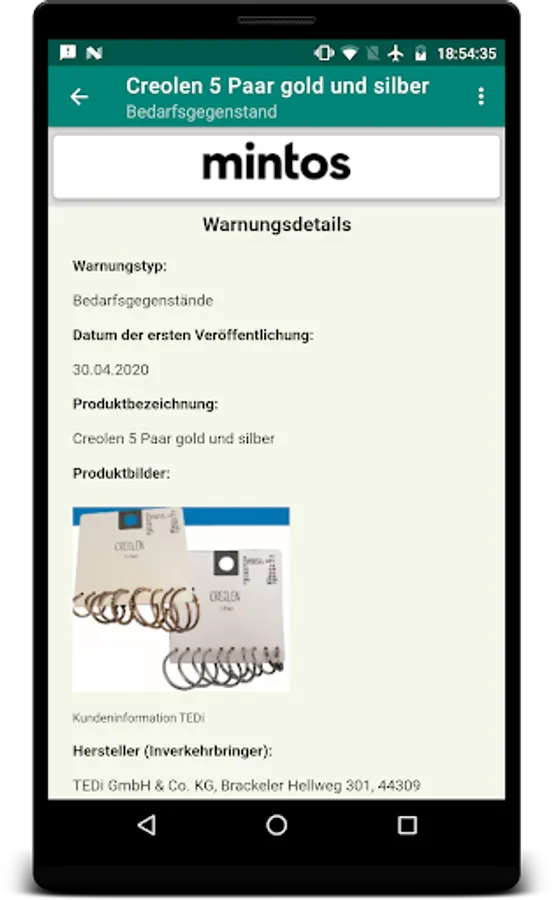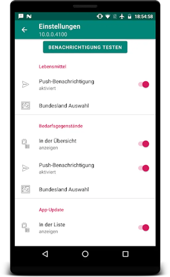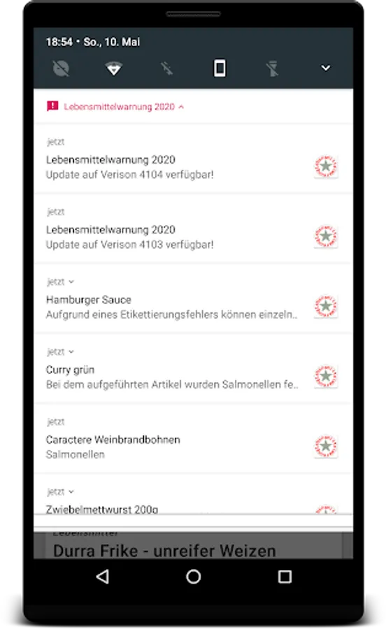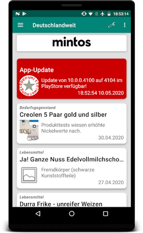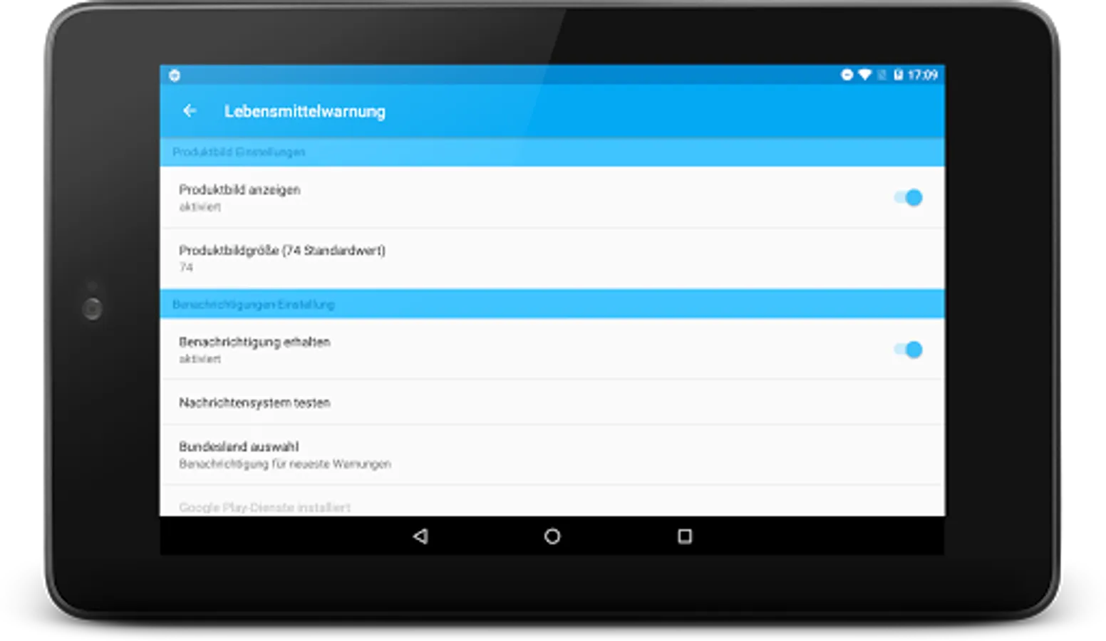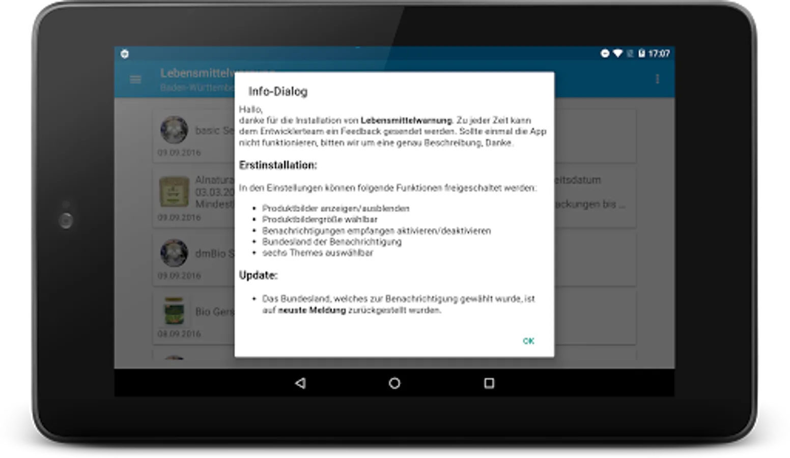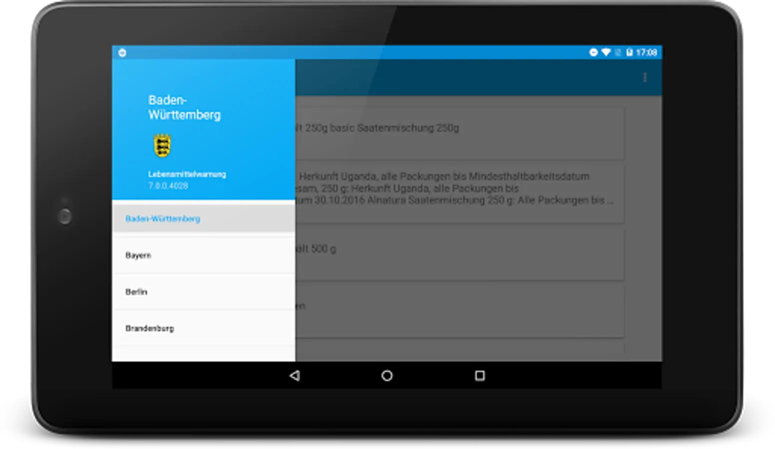 The application displays a warning of "Lebensmittelwarnung.de" on. Divided into provinces and overall message.