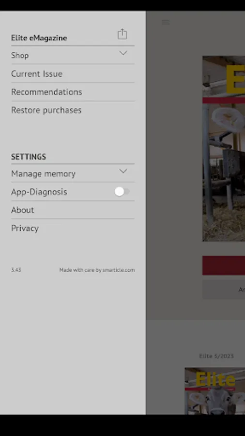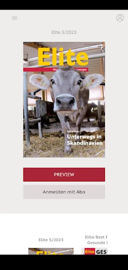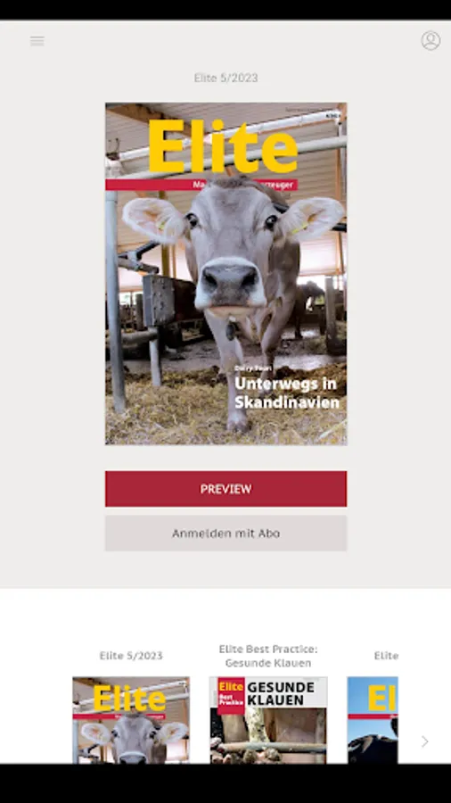 Elite is the leading magazine for modern dairy farming. The main topics are herdmanagement, reproduction, feeding, health, technology. Special information for livestock farmers is included. Everything in each print issue is included in the eMagazine, often linked to extra picture galleries or videos. The Elite app is free for use. Those with a print subscription have tablet access included. The one-time login requires only your username and password for the website elite-magazin.de