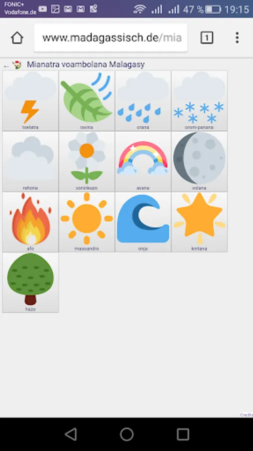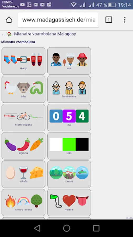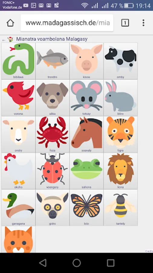 Every word has a picture and is available as a sound file by a native speaker of Malagasy. Suitable for small children. No adds, no BS, works 100% off line.